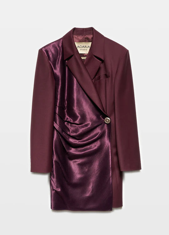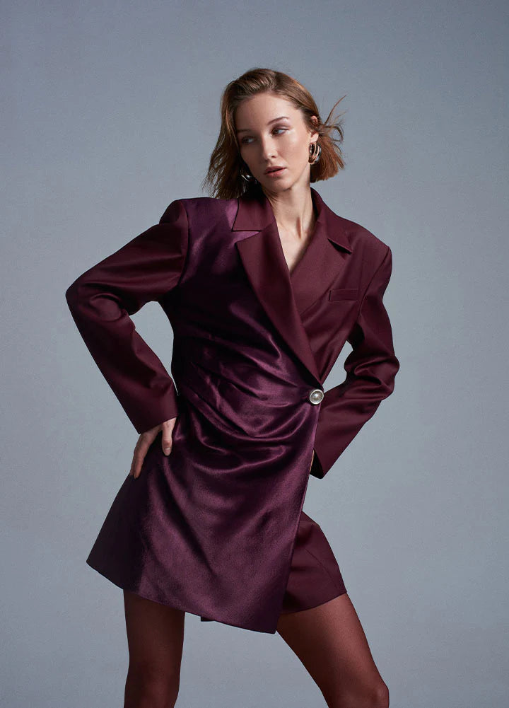 Mürdüm, uzun kollu mini boy ceket elbise modelidir. Klasik ceket yaka tasarımına sahiptir ve omuzları belirgin vatkalıdır. Ceket tarzı elbisenin önü kruvaze kesimdir ve tek bir büyük metalik düğme ile yandan kapanır. Elbisenin sağ ön kısmında, ana kumaştan farklı parlak saten kumaş paneli bulunur ve bu panel üzerinde drapaj büzgü detayları kullanılmıştır. Kollarında üç adet küçük metalik düğme detayı yer alır. Arkası düz ve klasik ceket formundadır.