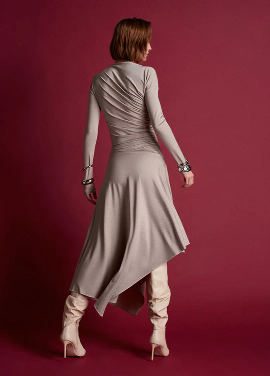 Detaylar: Uzun kol, ön sırt ve yan drapaj büzgü detayı, asimetrik etek kesimi