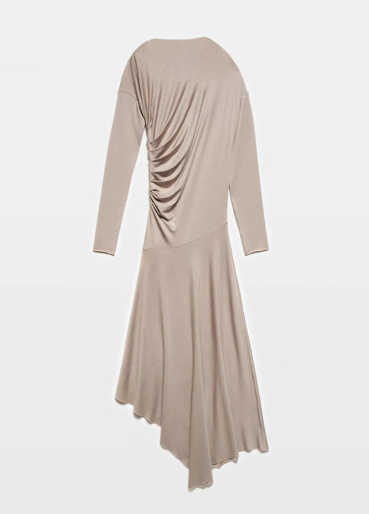Kum beji tonlarında, uzun kollu midi boy elbise modelidir. Üst kısmı vücuda oturan kesimdedir. Ön, sırt ve yan kısımlarda drapaj (büzgü) detayları kullanılarak asimetrik bir görünüm yaratılmıştır. Etek kısmı asimetrik kesim olup, bir tarafı daha uzun, bir tarafı daha kısa inmektedir. Esnek, ince ve dökümlü jarse kumaştan üretilmiştir.