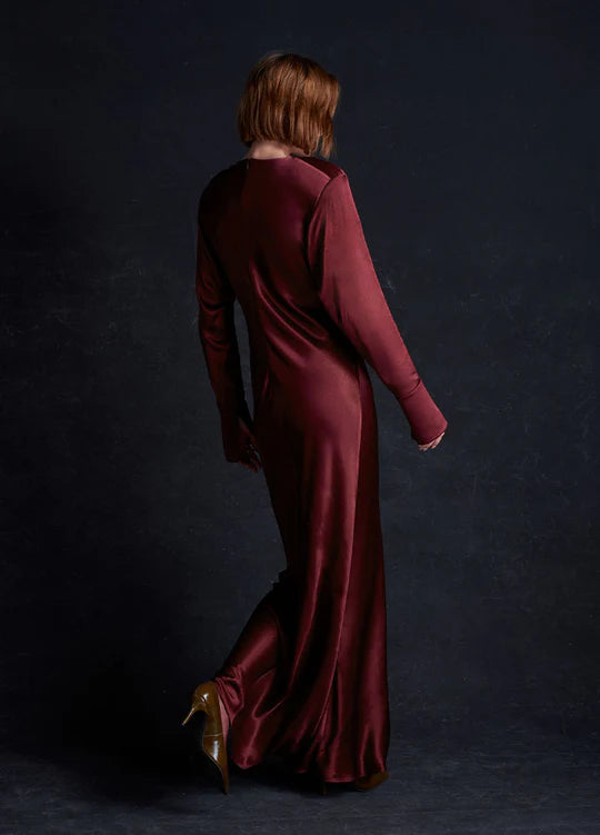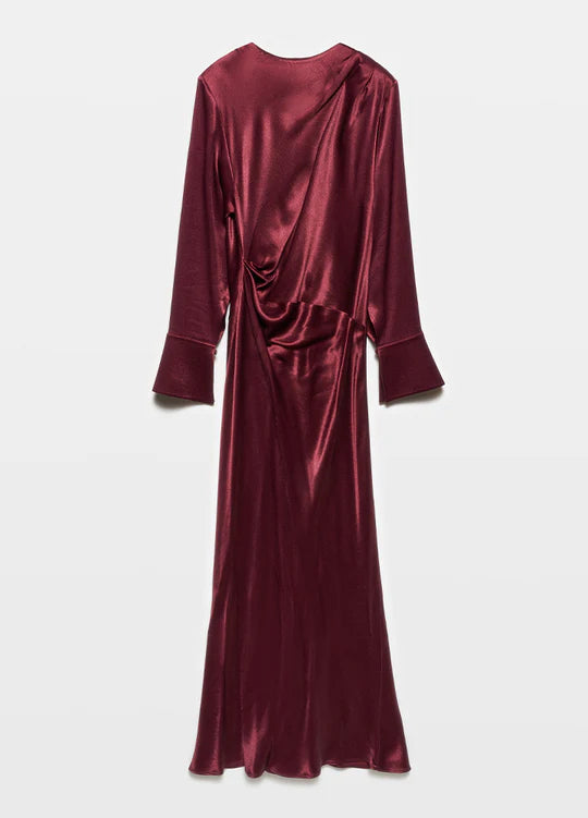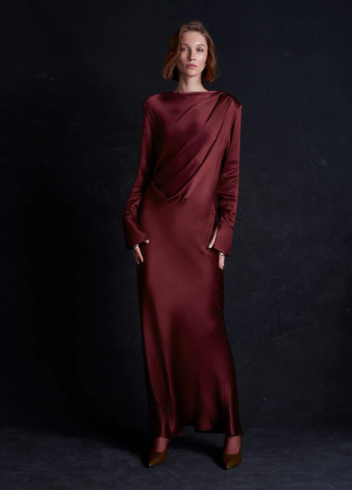 Koyu şarap renginde, uzun kollu maksimum boy elbise modelidir. Yaka kısmı kayık yaka veya geniş yaka şeklinde tasarlanmıştır. Yakanın ön ve yan kısımlarında, bel hizasına kadar uzanan drapaj (büzgü) detayı kullanılmıştır. Elbise genel olarak vücuda dökümlü ve gevşek bir kesime sahiptir. Uzun kolların uçları geniş manşet görünümündedir. Parlak ve kaygan yapıda bir kumaştan üretilmiştir.