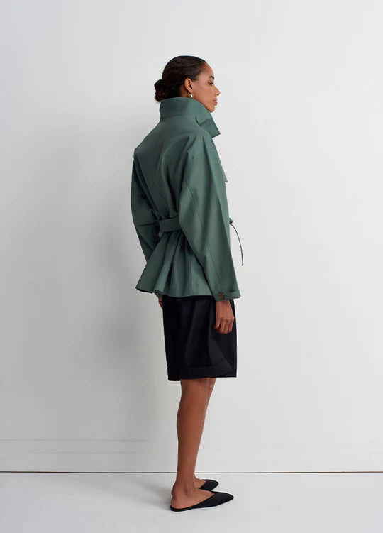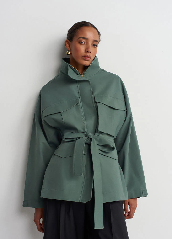 Koyu yeşil veya nefti yeşil tonlarında, uzun kollu kısa boy ceket modelidir. Yaka kısmı dik yaka şeklinde tasarlanmıştır ve ön ortadan gizli fermuar veya patlet kapama detayı bulunur. Genel kesimi oversize (geniş) ve rahat bir kalıba sahiptir. Ön kısımda üst ve alt olmak üzere her iki yanda da kapaklı büyük cepler yer alır. Belde ceketin kendi kumaşından yapılmış, bağlamalı kuşak kemer detayı bulunur. Manşetler sade ve düzdür.