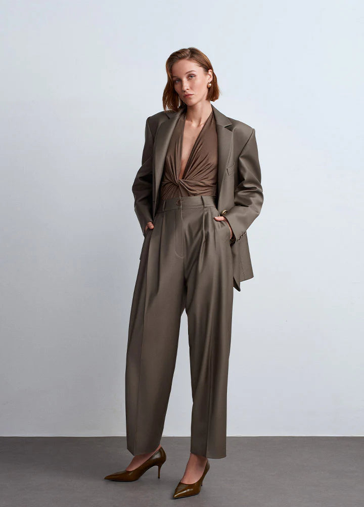 Kahverengi tonlarında, yüksek bel kesimli geniş paça pantolon. Ön kısmında pilili detaylar bulunur. Yanlarda cepler yer alır. Düz kesim formuyla rahat bir siluete sahiptir.