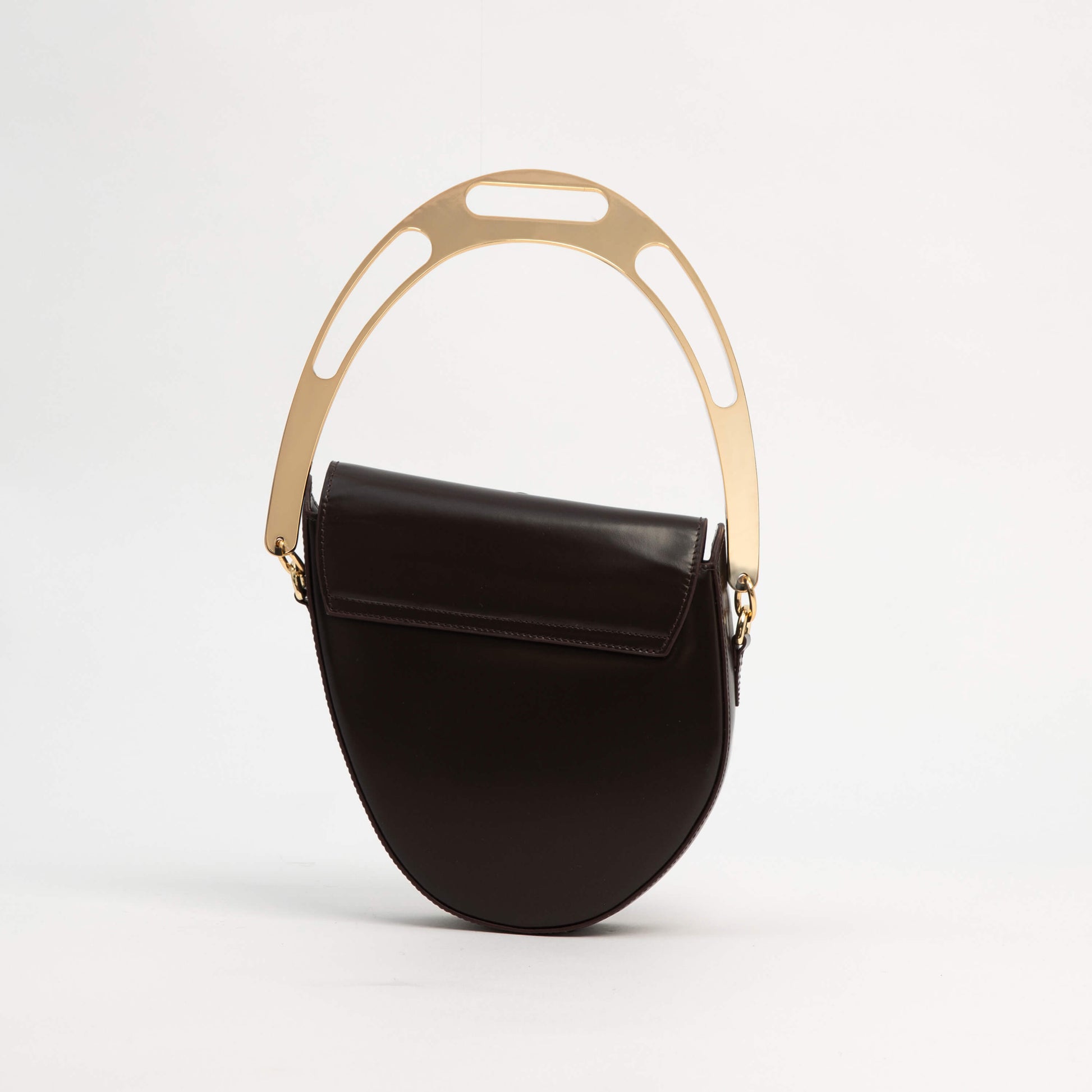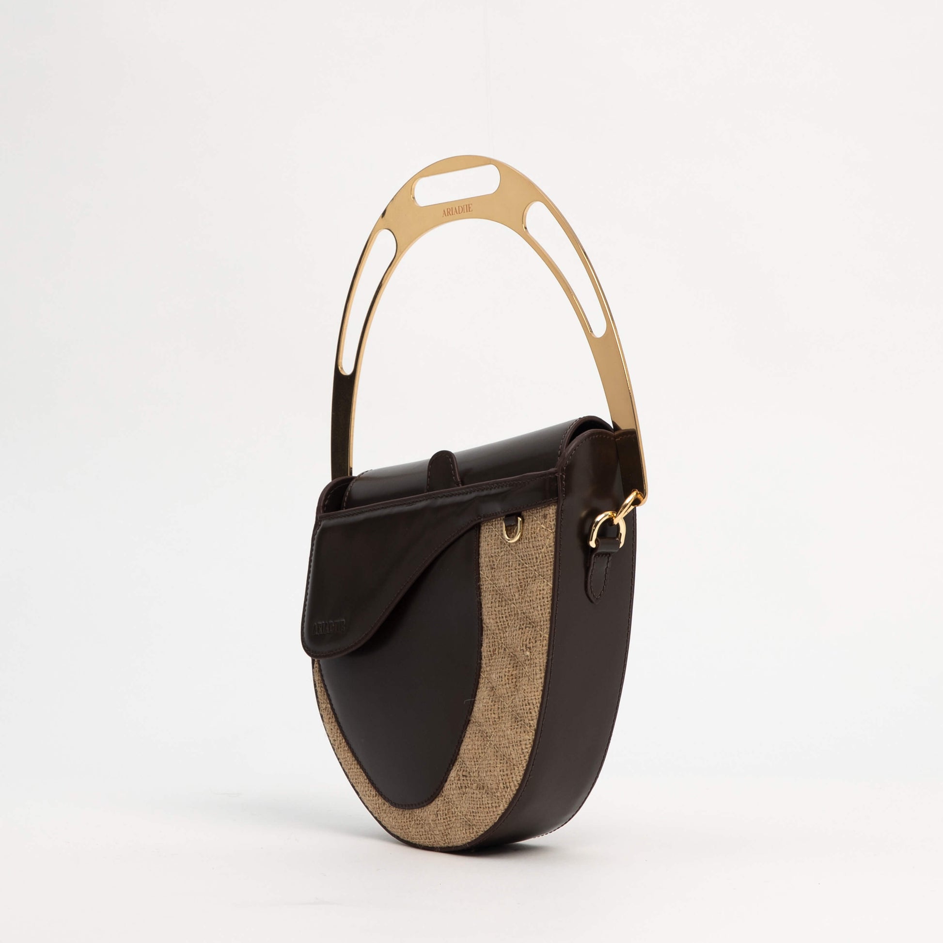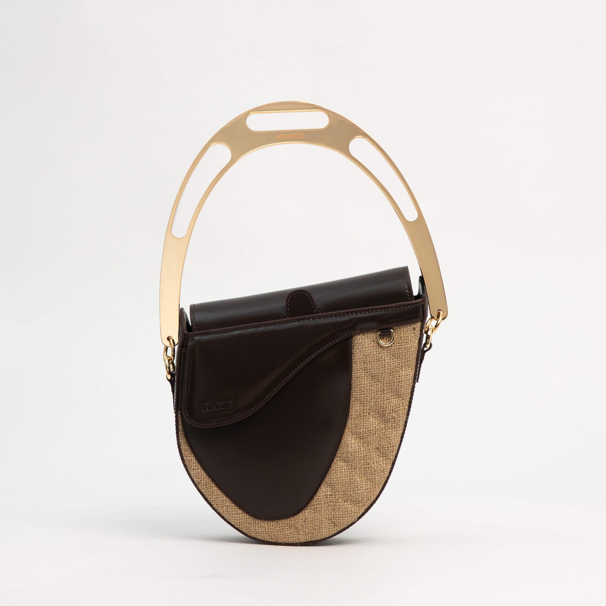 Napa deri, Geri dönüştürülmüş kahve çuvalından, Gold kaplama metal tasarım kollu, Mıknatıs kapamalı, ön yüzeyinde Ariadne baskılı, ayarlanabilir askılı el yapımı tasarım çanta.