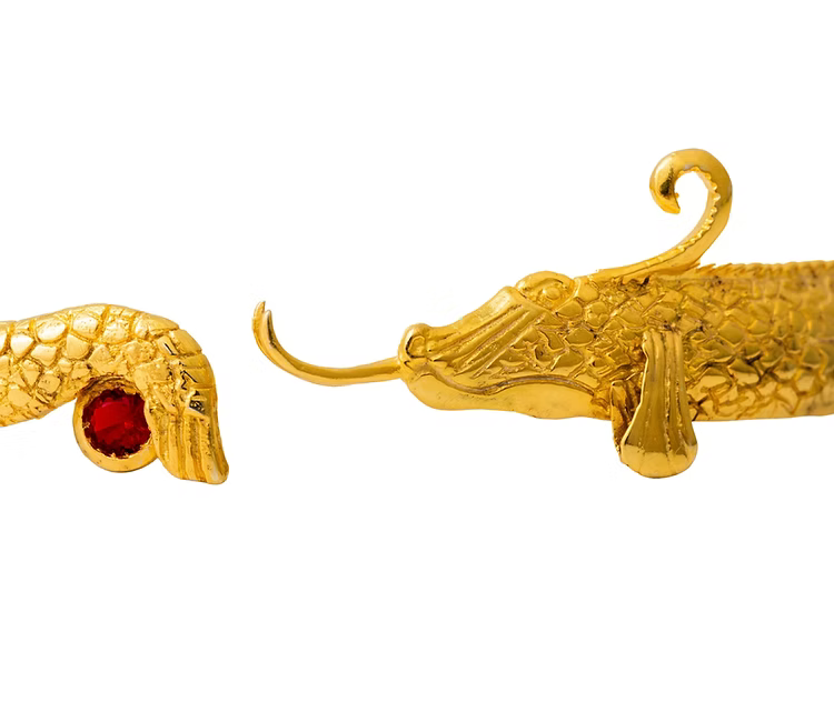 İnce bant formunda, iki ucu kırmızı taş detaylı ve pullu dokulu ejderha/yılan figürleriyle tamamlanmış, zarif ve iddialı choker.