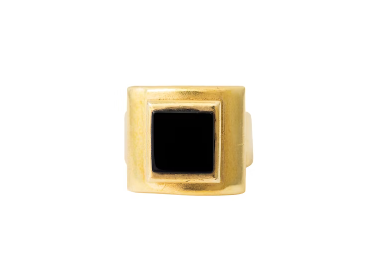 Geniş ve kalın bant formunda, ortasında kare kesim siyah oniks taşı bulunan modern ve iddialı bir yüzüktür.
