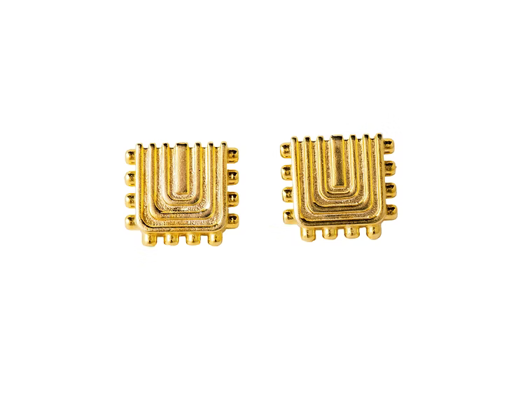 Geometrik, kare formda ve Art Deco tarzı katmanlı desenlere sahip küpe.