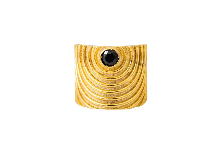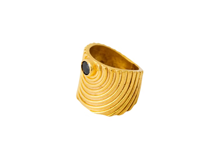 Dalgalı (wave) yüzey dokusuna sahip, ortasında oniks taş detayı bulunan kalın ve geniş formda bir yüzüktür.