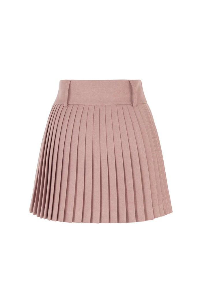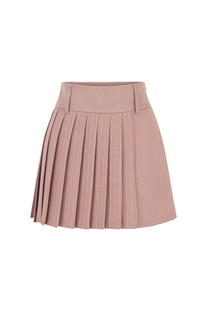 Çizgili ve düz kontrast kumaşlı, Pilili ön kısım ayrıntılı, Yan bedenden gizli fermuar kapama mini etek.