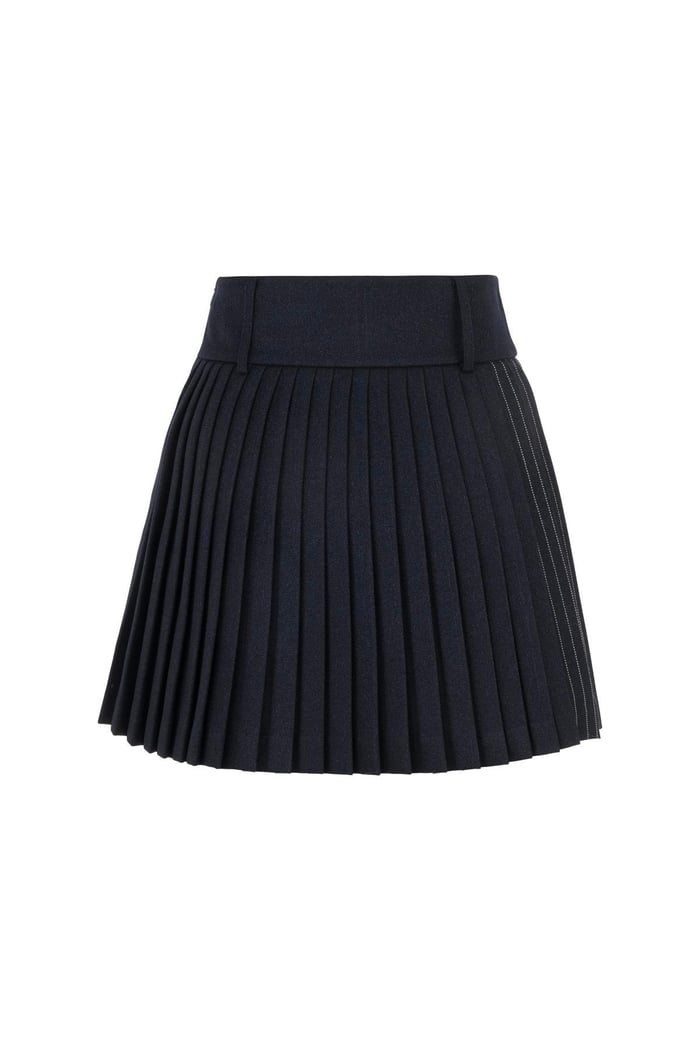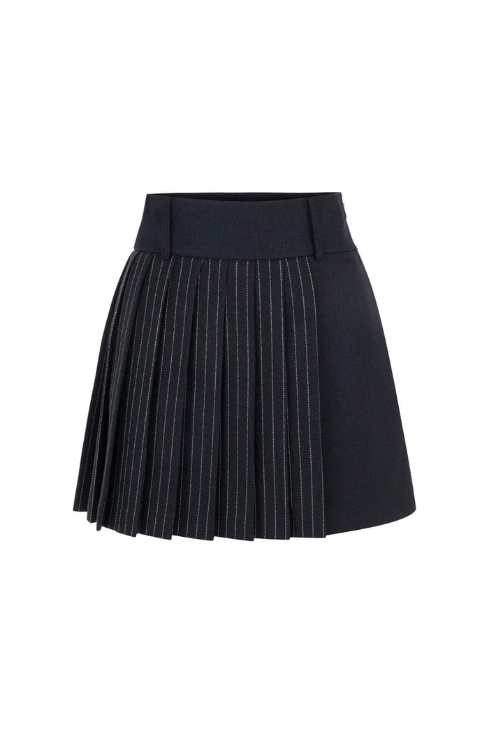 Çizgili ve düz kontrast kumaşlı, Pilili ön kısım ayrıntılı, Yan bedenden gizli fermuar kapama mini etek.