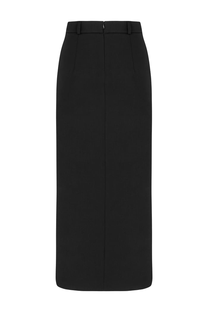 Düz kesim, yüksek bel, Çift yan yırtmaç detaylı, arka bedende gizli fermuar kapama maksi boy etek.