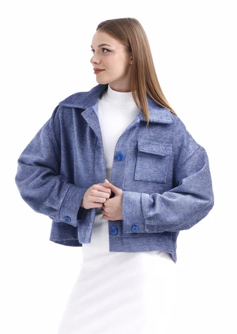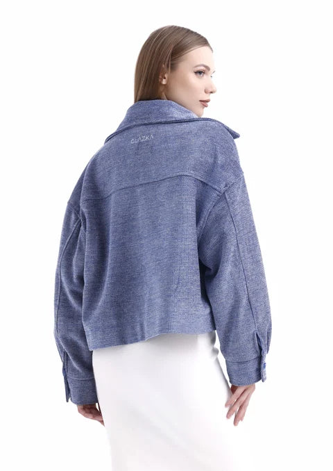 Mavi melanj renkte, uzun kollu kısa kesim (crop) ceket modelidir. Kumaşı dokulu ve hafif pütürlü bir görünüme sahiptir. Klasik gömlek yaka tarzındadır ve önü orta boy yuvarlak mavi düğmelerle kapanır. Genel kesimi oversize ve düşük omuzlu bir kalıba sahiptir. Ön yüzeyde sol göğüs hizasında kapaklı tek bir cep detayı yer alır. Manşetler düğmeli olup, arka yaka kısmında nakışla işlenmiş bir logo (GLAZKA) bulunur.