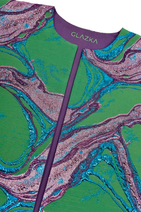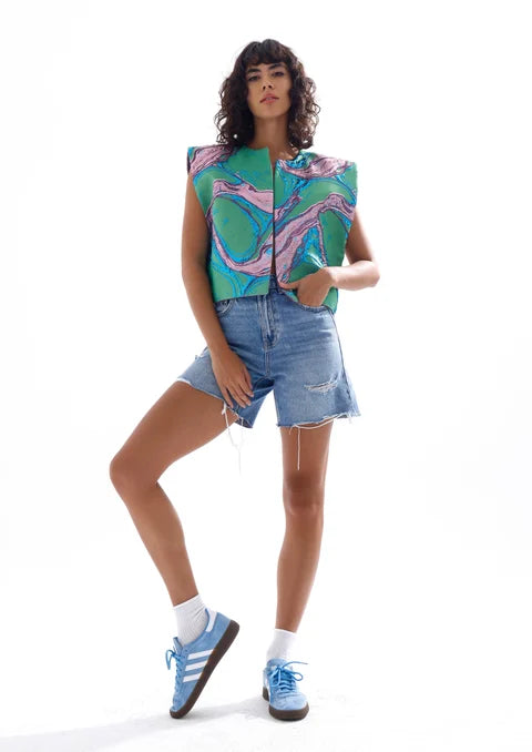 Çok renkli jakar kumaştan üretilmiş, kolsuz kısa kesim (crop) yelek modelidir. Jakar kumaşın dokusu yüksek kabartmalı ve hafif ışıltılıdır. Yeleğin yakası sıfır yaka tarzındadır ve ön ortası açık, omuzları geniş ve belirgindir. Kesimi bele oturan ve kısa boyludur.