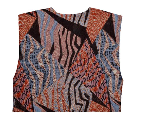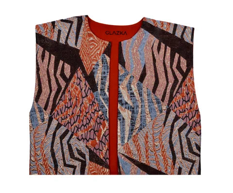 Çok renkli jakar kumaştan üretilmiş, kolsuz kısa kesim (crop) yelek modelidir. Jakar kumaşın dokusu yüksek kabartmalı ve hafif ışıltılıdır. Yeleğin yakası sıfır yaka tarzındadır ve ön ortası açık, omuzları geniş ve belirgindir. Kesimi bele oturan ve kısa boyludur.