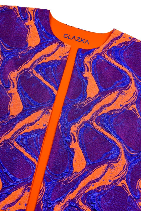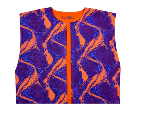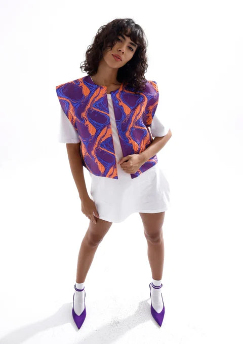 Çok renkli jakar kumaştan üretilmiş, kolsuz kısa kesim (crop) yelek modelidir. Jakar kumaşın dokusu yüksek kabartmalı ve hafif ışıltılıdır. Yeleğin yakası sıfır yaka tarzındadır ve ön ortası açık, omuzları geniş ve belirgindir. Kesimi bele oturan ve kısa boyludur.