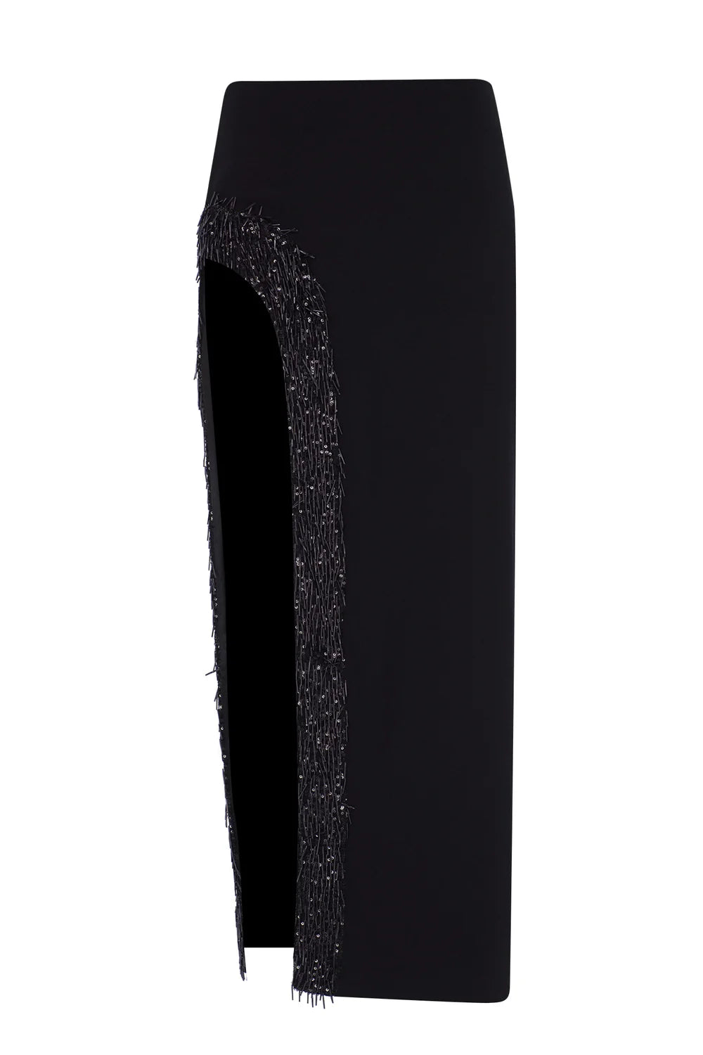 Siyah midi boy etek. Yüksek bel tasarımlı. Yan kısmında derin yırtmaç bulunur. Yırtmaç boyunca püskül ve taş detayları yer alır.
