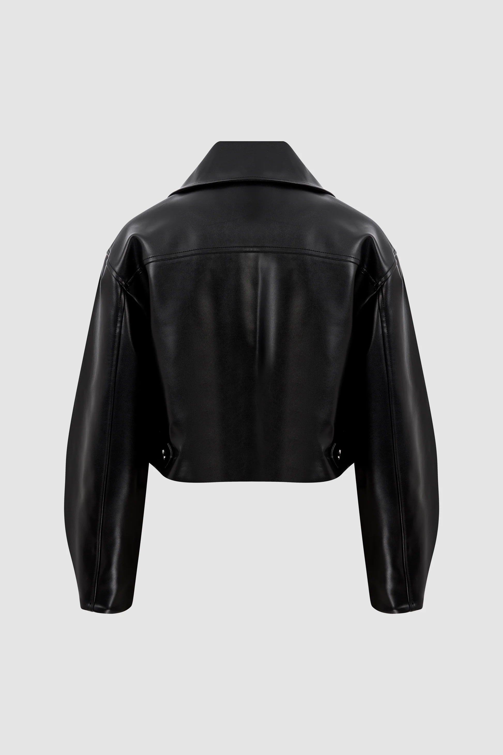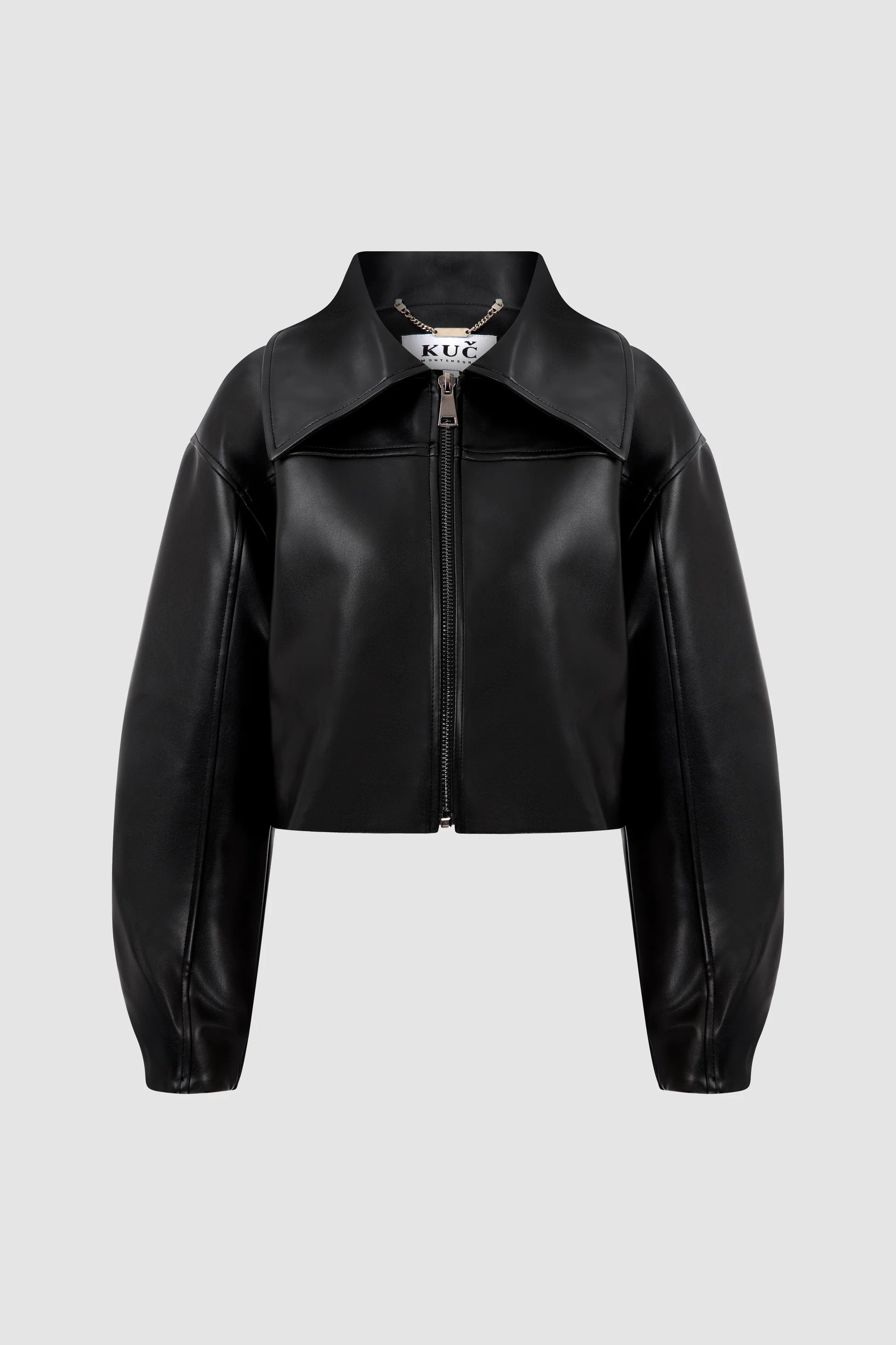 Siyah renkte, uzun kollu kısa kesim (crop) deri ceket modelidir. Ceketin yakası geniş ve katlamalı bir tasarıma sahiptir. Ön ortadan fermuar ile kapanır. Omuzları ve kolları düşük ve bol kesimli olup, balon kol etkisine sahiptir. Kesimi genel olarak oversize ve rahattır. Ceketin alt etek ucunda ve kol manşetlerinde siyah düğme ile ayarlanabilir bant detayları bulunur. Deri, parlak ve yumuşak görünümlüdür.