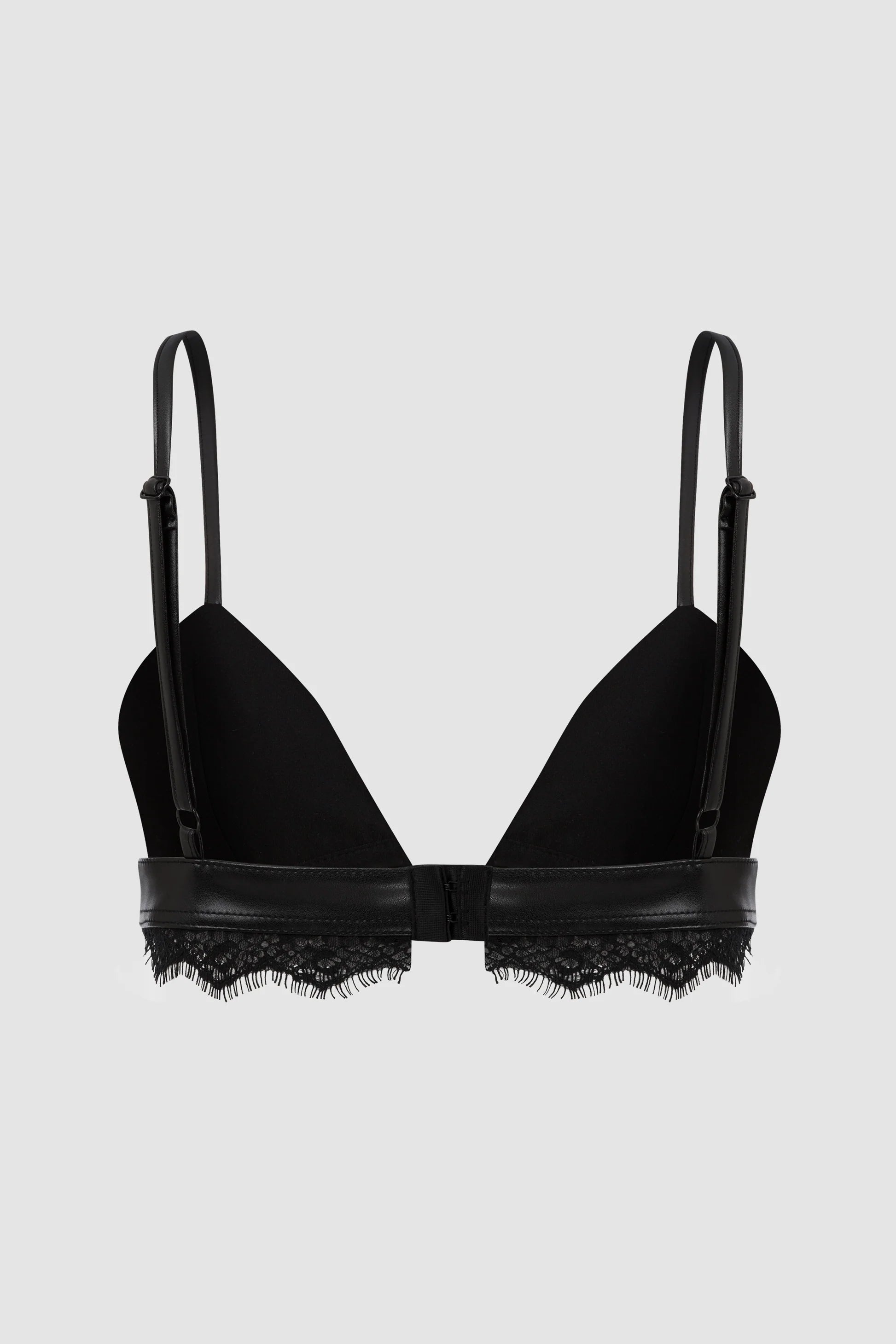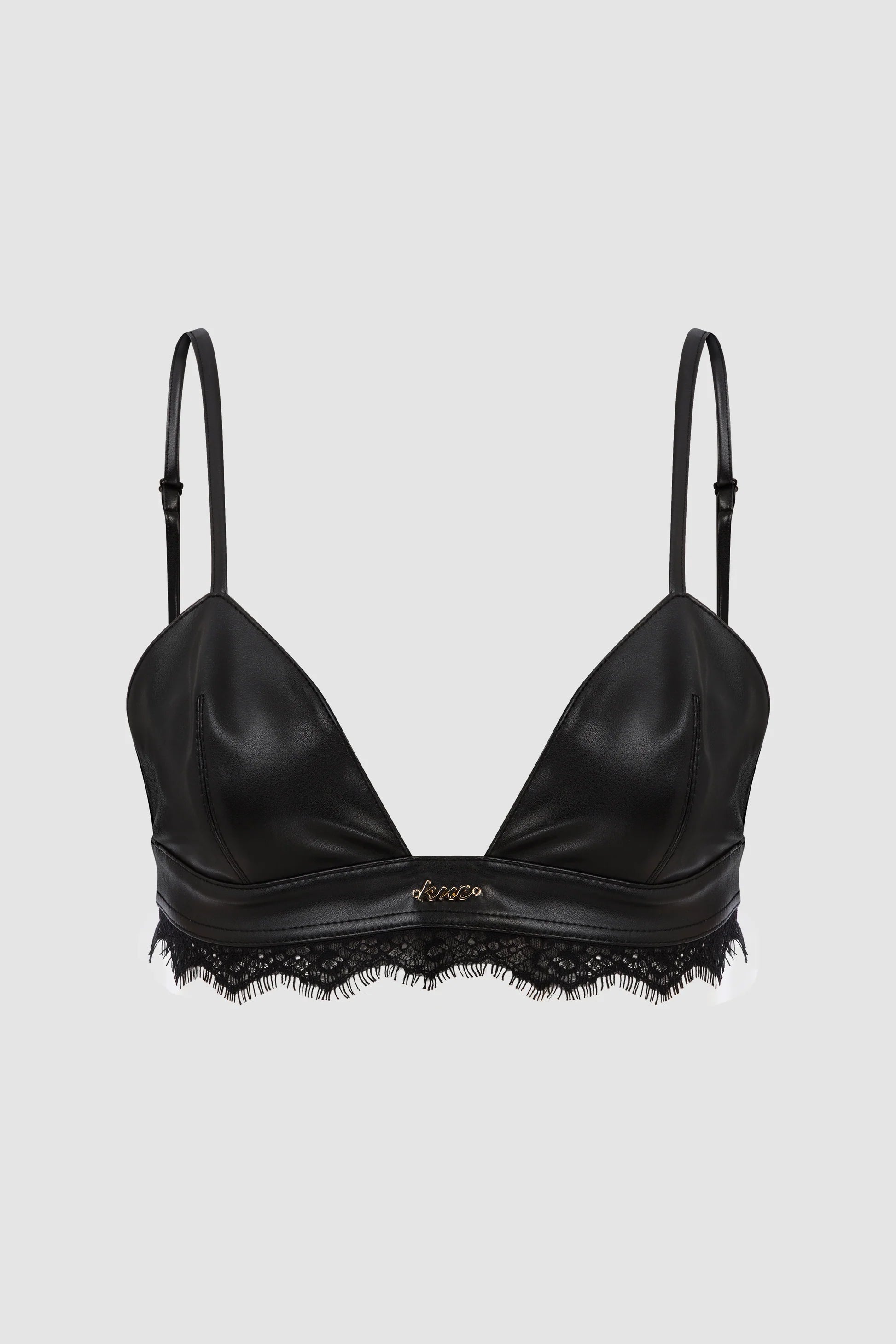 Siyah renkte, üçgen kuplu bralet modelidir. Kupların tamamı deri görünümlü kumaştan yapılmıştır. İnce ve ayarlanabilir askılara sahiptir. Göğüs alt bandı da deri görünümlü kumaştan olup, etek ucu ince dantel veya tül detaylarıyla tamamlanmıştır. Ön orta kısımda küçük altın rengi metal logo aksesuarı yer alır. Arka kapaması kopça ile yapılır.