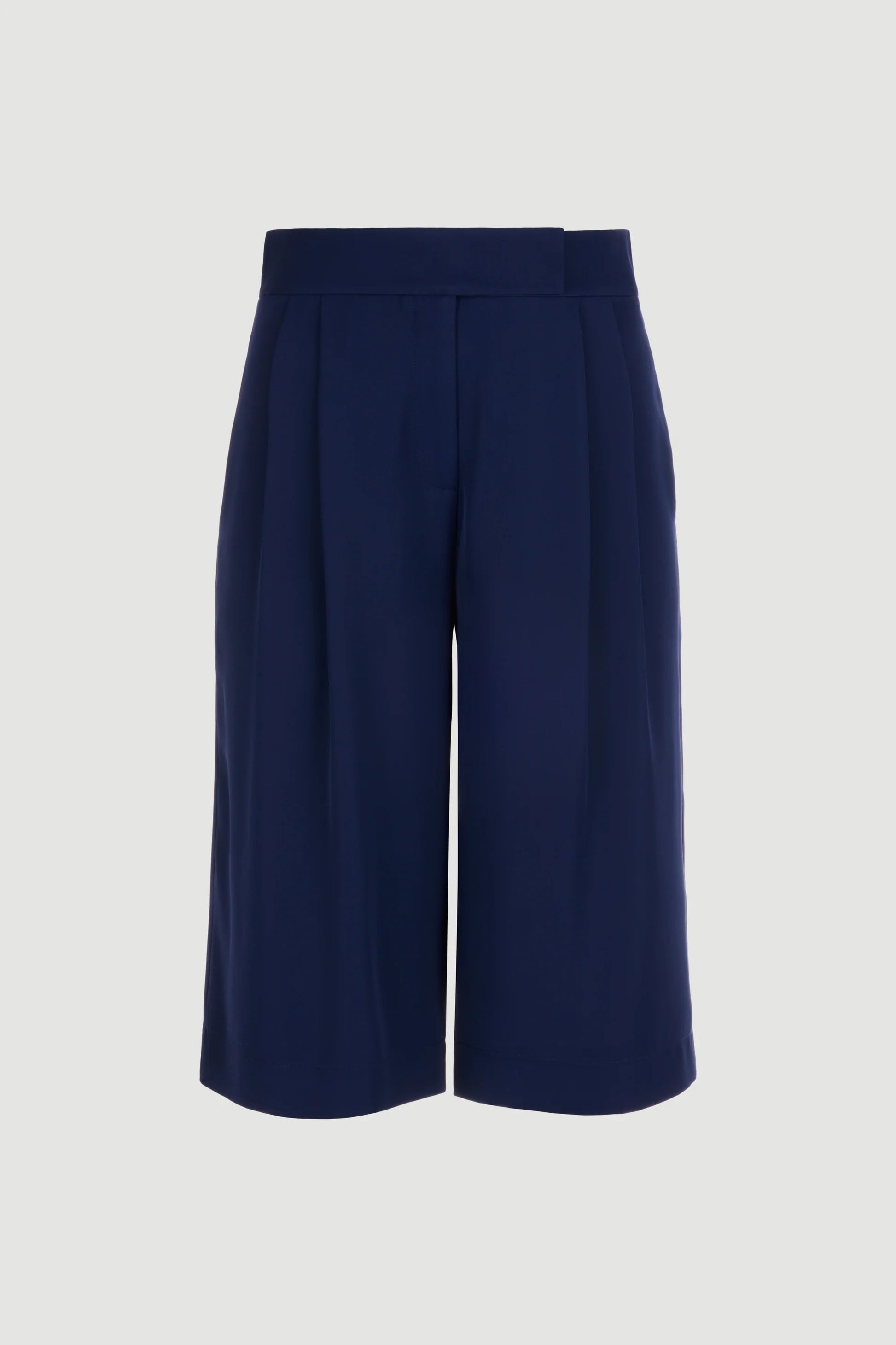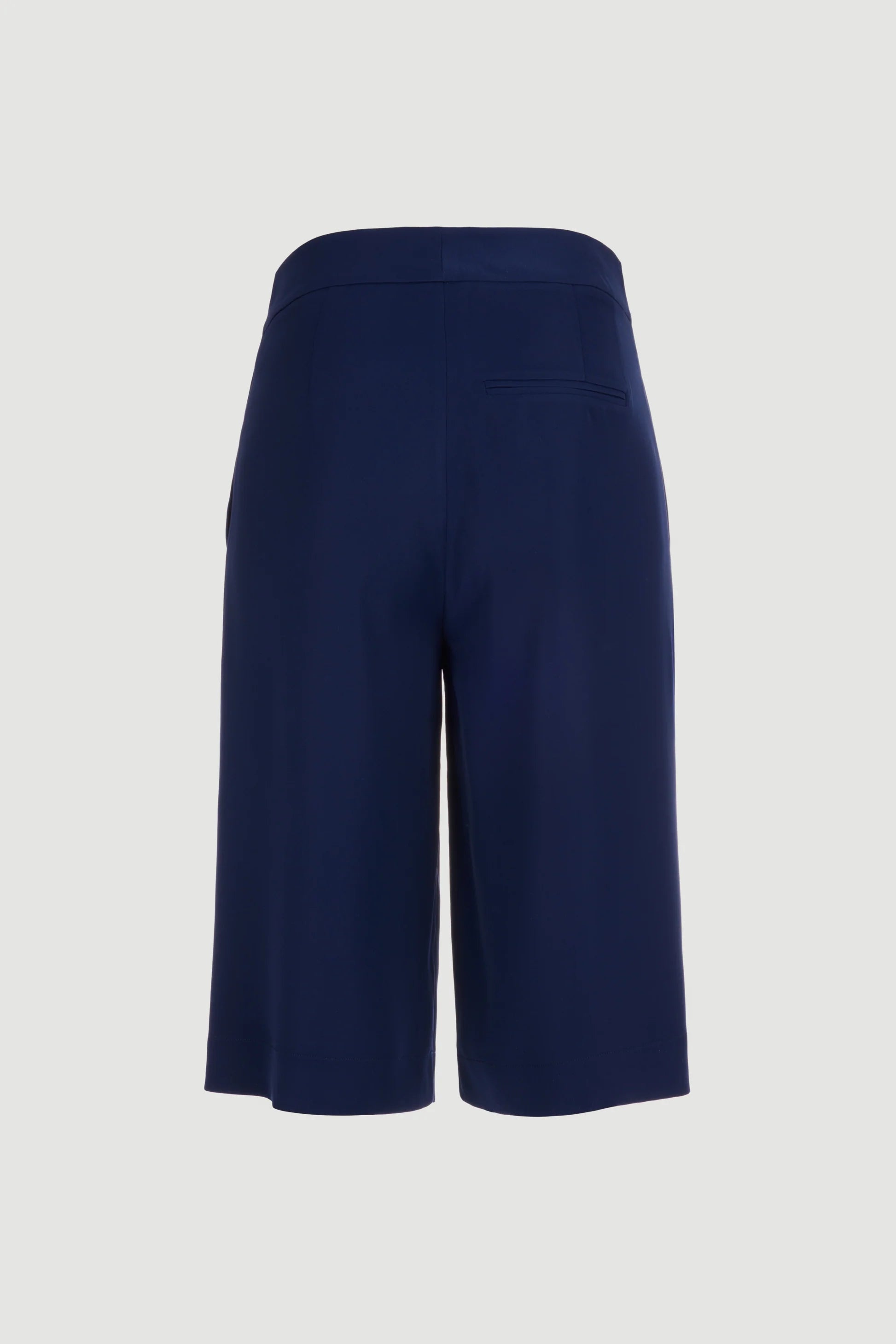 Koyu lacivert tonlarında, yüksek bel kumaş pantolon modelidir. Kesimi diz altında biten şort etek (culotte) tarzındadır ve paçaları geniş kesimlidir. Ön kısımda bele oturan ve aşağıya doğru inen geniş pile detayları bulunur. Ön ortadan gizli fermuar ve kopça ile kapama mevcuttur. Arka kısmında sağ yanda tek bir torba cep detayı yer alır.