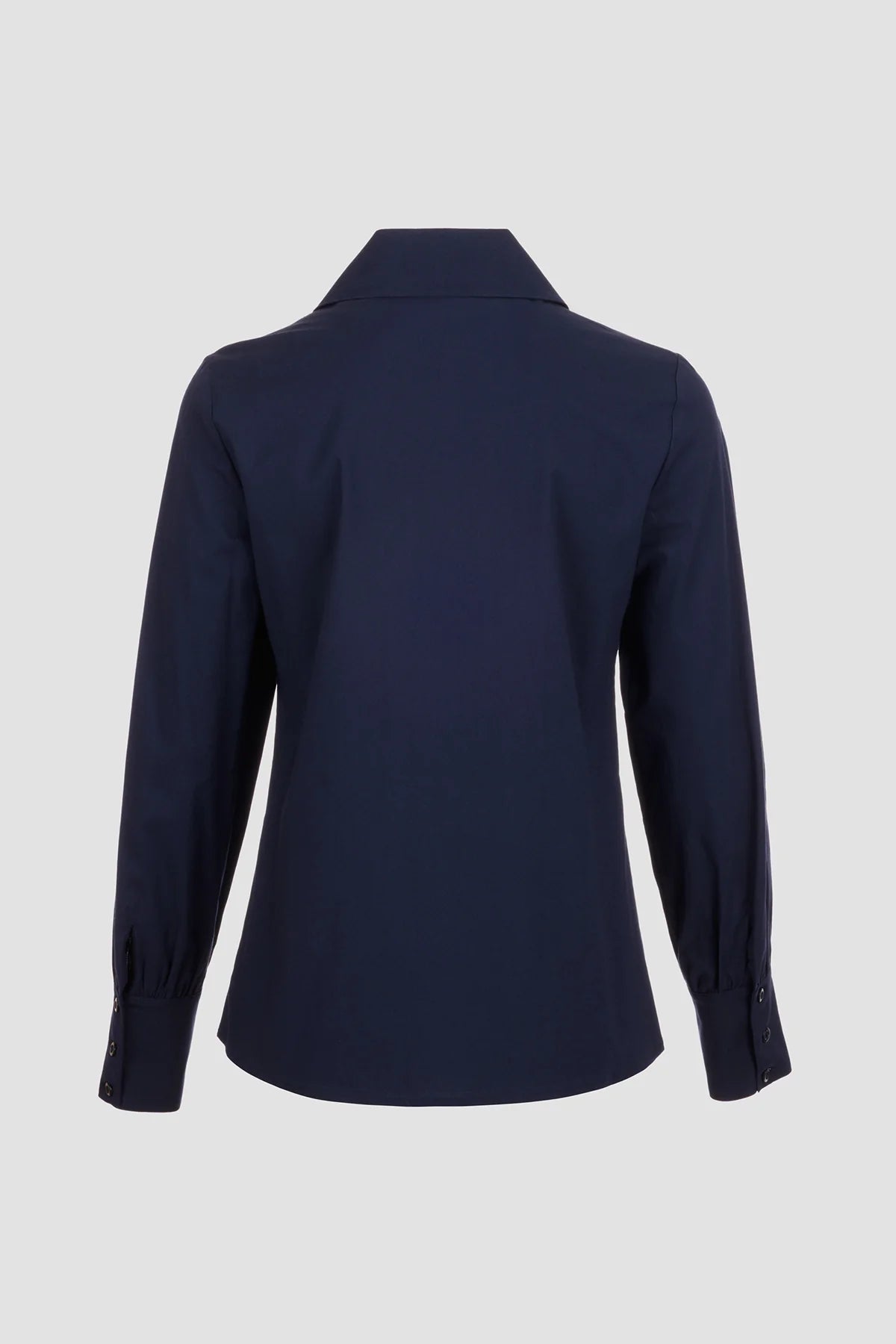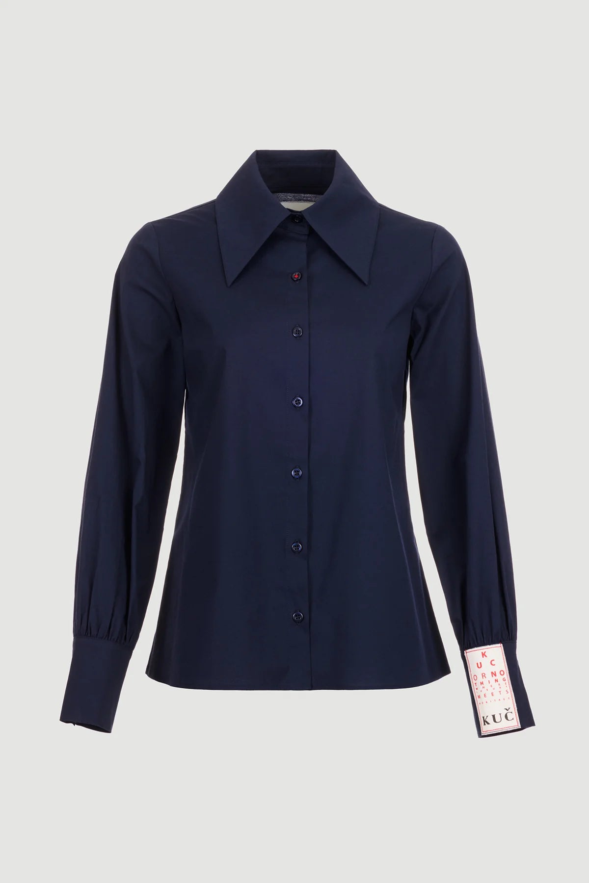 Lacivert, uzun kollu gömlek modelidir. Geniş ve sivri uçlu klasik gömlek yaka tasarımına sahiptir. Ön ortadan, gömlek rengiyle uyumlu yuvarlak düğmelerle kapanır. Kollar, manşet kısmına doğru hafifçe bollaşan yapıdadır ve manşetler üç adet düğme ile kapanır. Gömleğin kesimi bele doğru hafifçe oturan bir silüet çizer. Sol kol manşetinde marka logosu ve yazıları bulunan dekoratif bir kumaş etiketi yer alır.