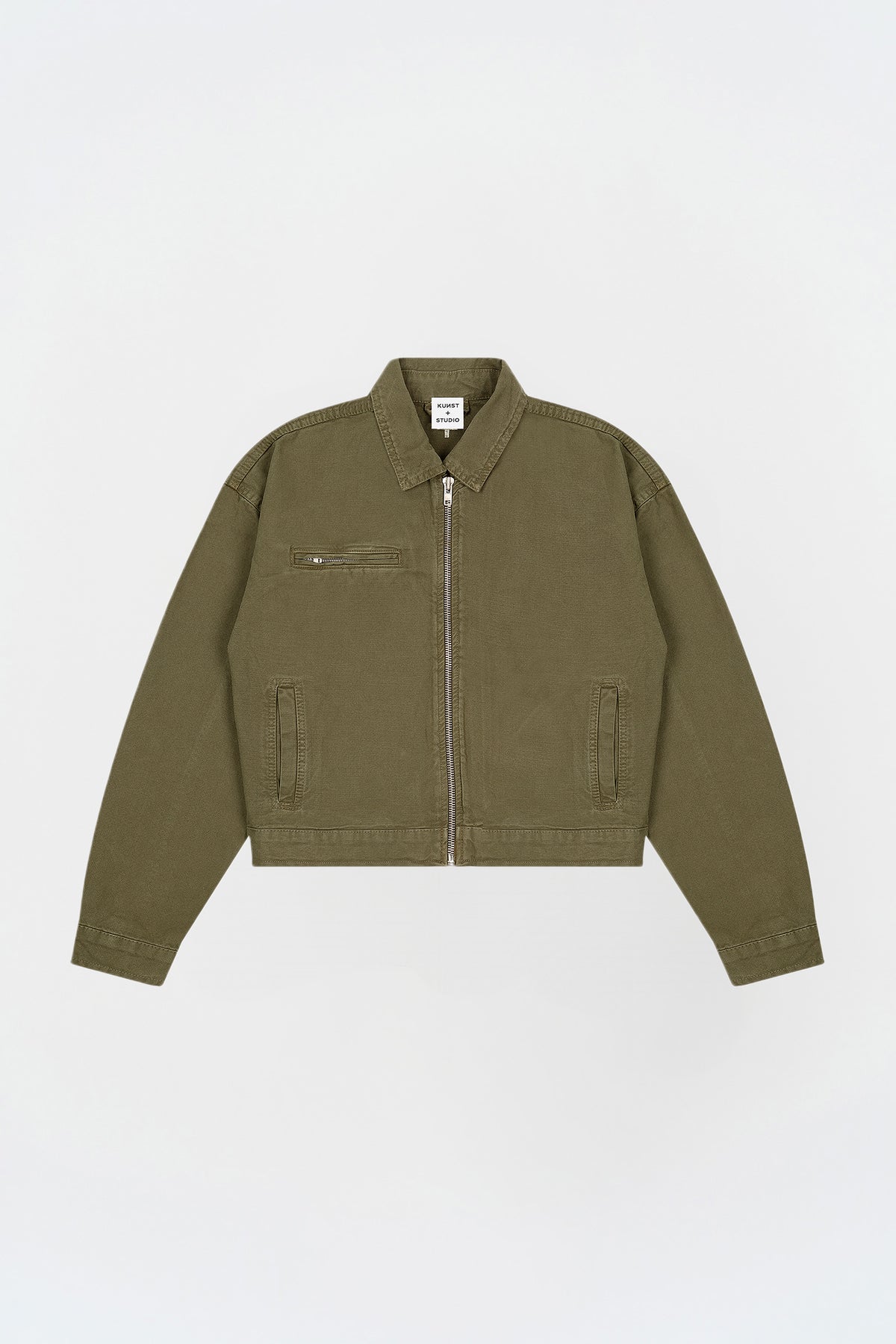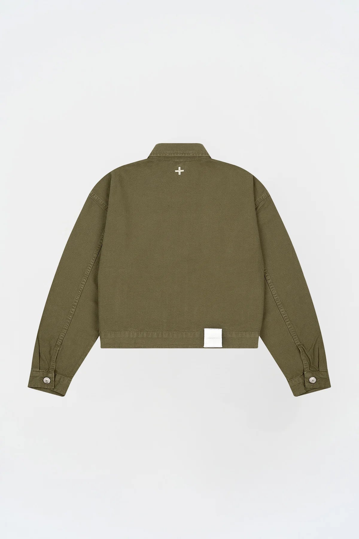 Haki yeşili tonlarında, uzun kollu kısa kesim (crop) ceket modelidir. Klasik gömlek yaka tasarımına sahiptir ve ön ortadan fermuar ile kapanır. Genel kesimi oversize ve rahat bir kalıba sahiptir. Ön yüzeyde sağ göğüs hizasında fermuarlı küçük bir cep detayı ve her iki yanda da dikey, dikişsiz yan cepler bulunur. Manşetler düğmeli ve sadedir. Arka yaka altında beyaz nakışla işlenmiş artı (+) işareti ve etek ucunun arka ortasında küçük beyaz bir etiket detayı yer alır.