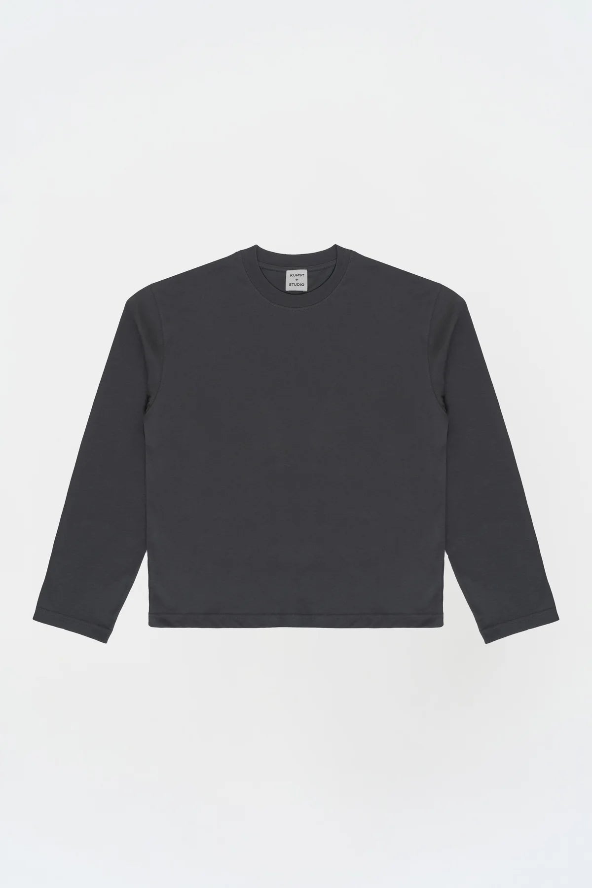 Gri renkte, uzun kollu, bisiklet yaka tişört veya ince sweatshirt modelidir. Kumaşı pürüzsüz, mat yüzeyli, tok ve düz bir yapıdadır. Kesimi düz ve normal/hafif gevşek (relaxed) bir kalıba sahiptir. Yaka ve manşet uçları, vücut kumaşıyla aynı renkte, ince ribana veya dikişle bitirilmiştir. Ön kısım tamamen sade olup, sadece yaka içinde küçük bir dokuma KUИST+STUDIO etiketi bulunur. Arka kısmında, ense hizasında, tonda tona (koyu gri üzeri koyu gri) küçük bir haç (+) amblemi nakış veya baskıyla işlenmiştir. Bu amblemin hemen altında ise el yazısı stilinde, tonda tona "Kunst Studio" yazısı yer alır. Omuz ve kol birleşim yerlerinde dekoratif dikiş detayları mevcuttur. Etek ucu düz kesimlidir.