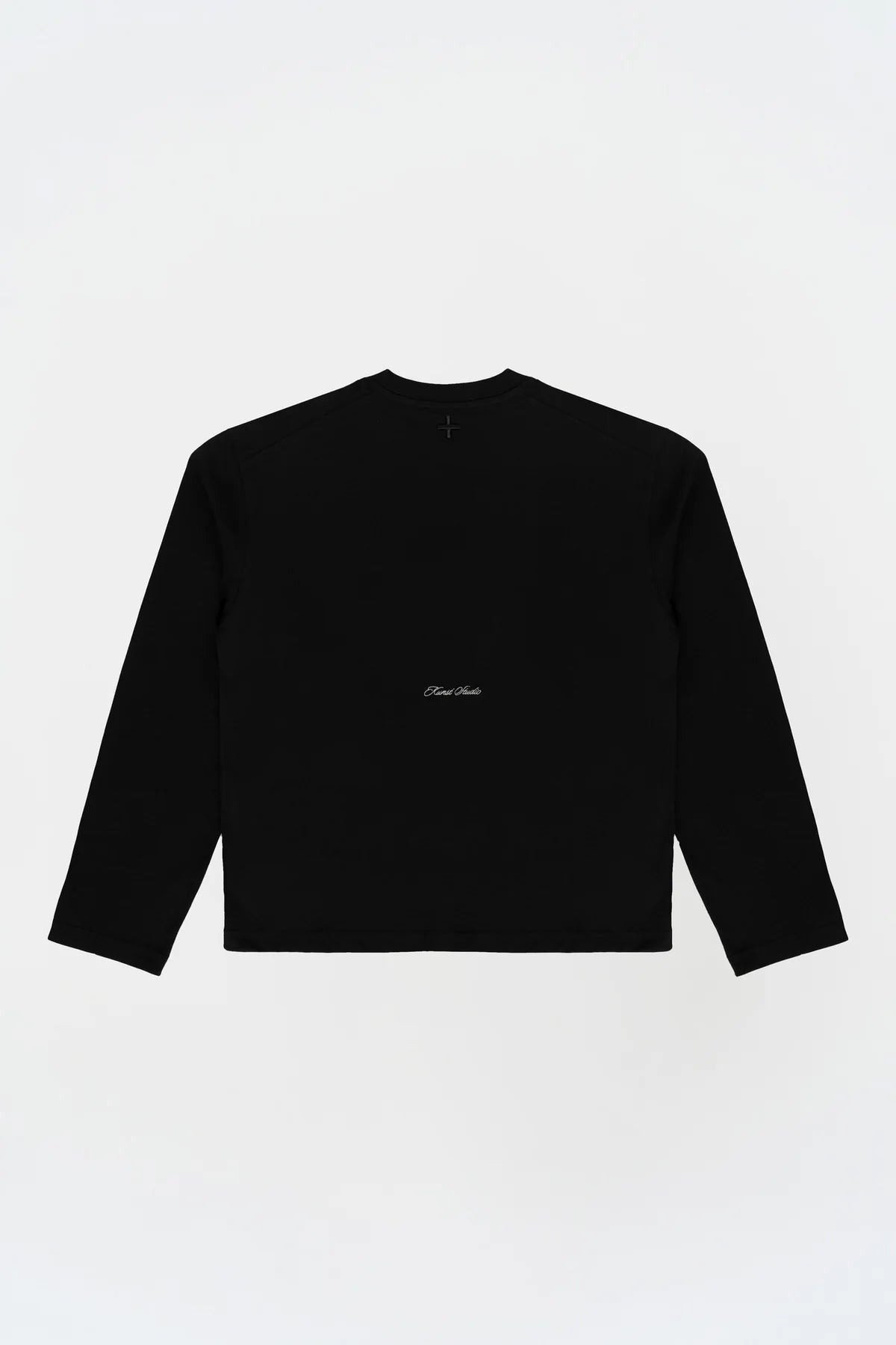 Siyah renkte, uzun kollu, bisiklet yaka tişört veya ince sweatshirt modelidir. Kumaşı pürüzsüz, mat yüzeyli, tok ve düz bir yapıdadır. Kesimi düz ve normal/hafif gevşek (relaxed) bir kalıba sahiptir. Yaka ve manşet uçları, vücut kumaşıyla aynı renkte, ince ribana veya dikişle bitirilmiştir. Ön kısım tamamen sade olup, sadece yaka içinde küçük bir dokuma KUИST+STUDIO etiketi bulunur. Arka kısmında, ense hizasında, tonda tona (koyu gri üzeri koyu gri) küçük bir haç (+) amblemi nakış veya baskıyla işlenmiştir. Bu amblemin hemen altında ise el yazısı stilinde, tonda tona "Kunst Studio" yazısı yer alır. Omuz ve kol birleşim yerlerinde dekoratif dikiş detayları mevcuttur. Etek ucu düz kesimlidir.