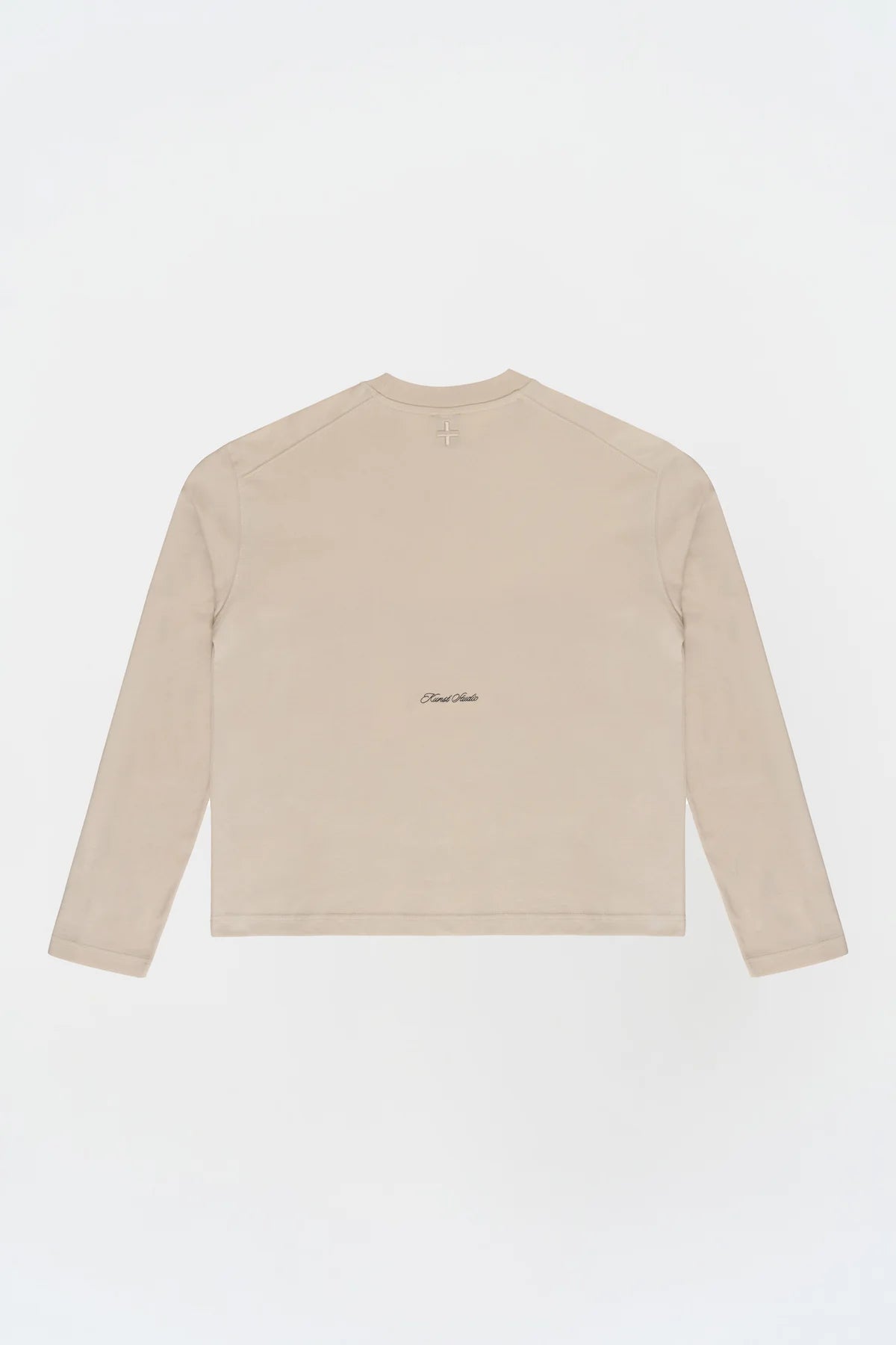 Krem renkte, uzun kollu, bisiklet yaka tişört veya ince sweatshirt modelidir. Kumaşı pürüzsüz, mat yüzeyli, tok ve düz bir yapıdadır. Kesimi düz ve normal/hafif gevşek (relaxed) bir kalıba sahiptir. Yaka ve manşet uçları, vücut kumaşıyla aynı renkte, ince ribana veya dikişle bitirilmiştir. Ön kısım tamamen sade olup, sadece yaka içinde küçük bir dokuma KUИST+STUDIO etiketi bulunur. Arka kısmında, ense hizasında, tonda tona (koyu gri üzeri koyu gri) küçük bir haç (+) amblemi nakış veya baskıyla işlenmiştir. Bu amblemin hemen altında ise el yazısı stilinde, tonda tona "Kunst Studio" yazısı yer alır. Omuz ve kol birleşim yerlerinde dekoratif dikiş detayları mevcuttur. Etek ucu düz kesimlidir.