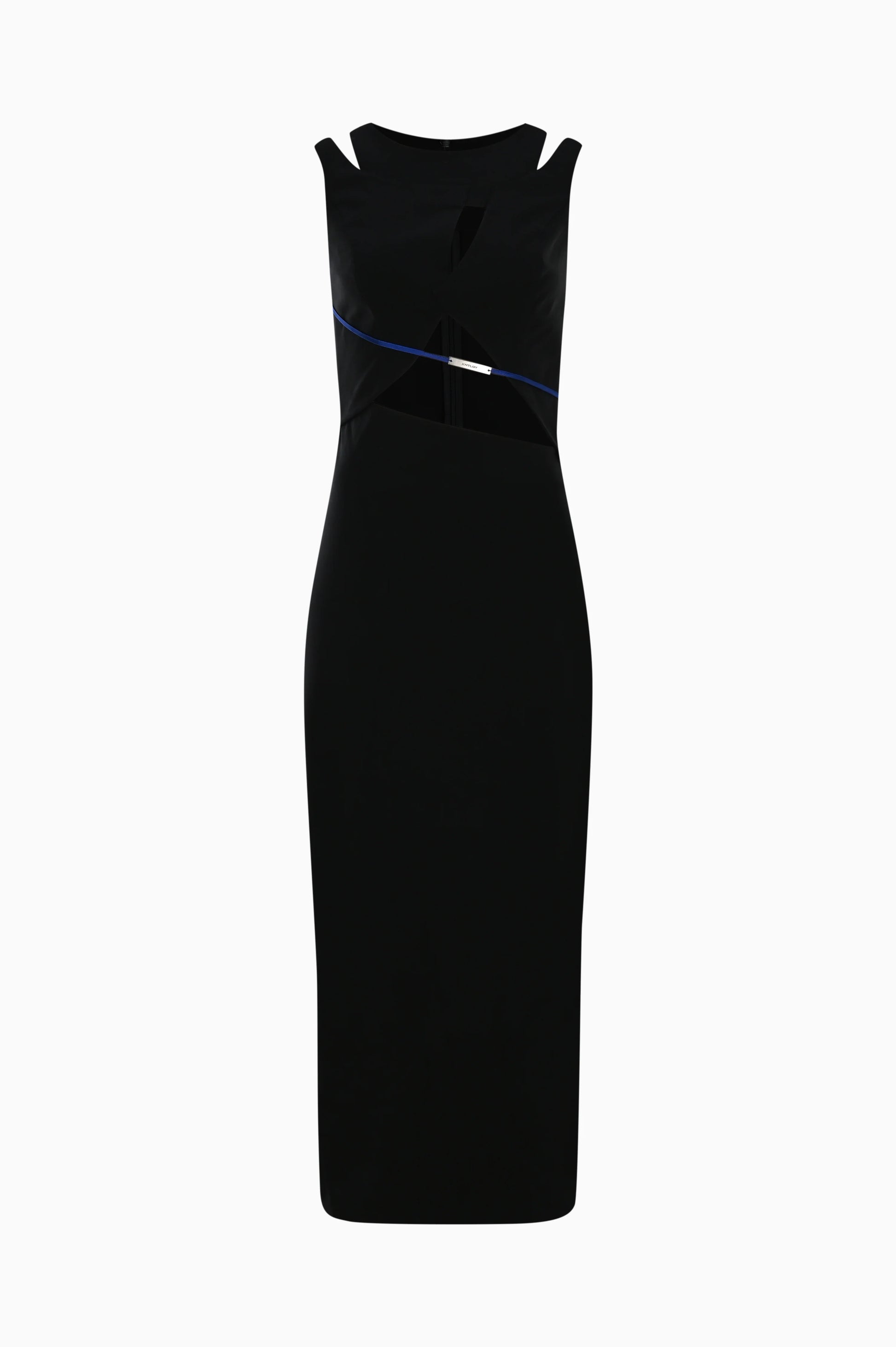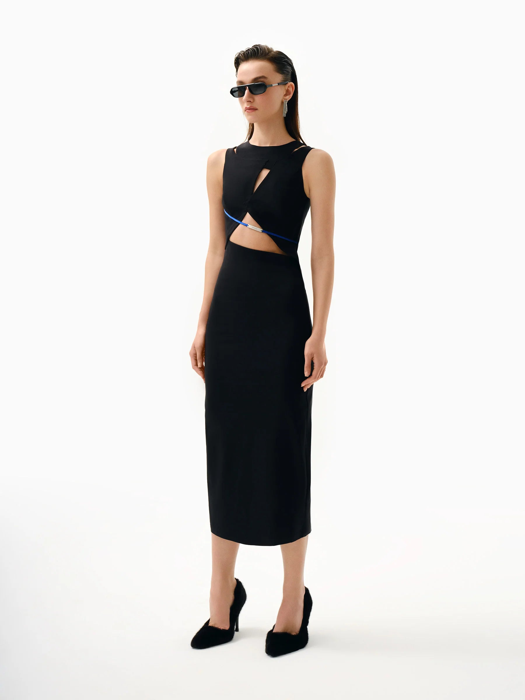 Streç kumaşlı, omuz ve bel kısmı pencere detaylı, biye şerit üzeri metal plaka işlemeli, yırtmaçlı, midi boy, siyah elbise.
