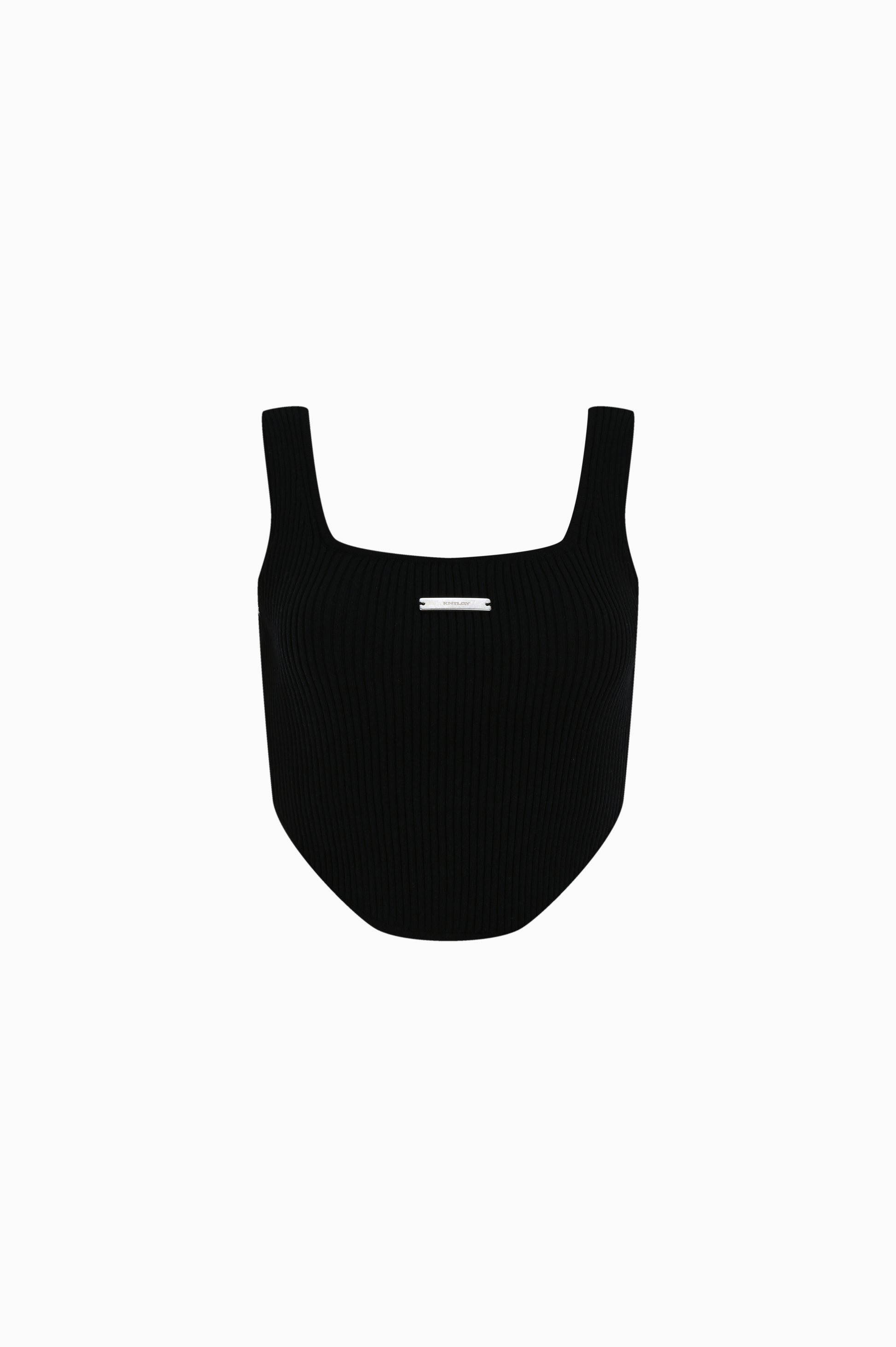 Kare yaka, kalın askılı, önü uzun arkası kısa asimetrik kesim, metal plaka detaylı, fitil örgülü, siyah triko crop top.