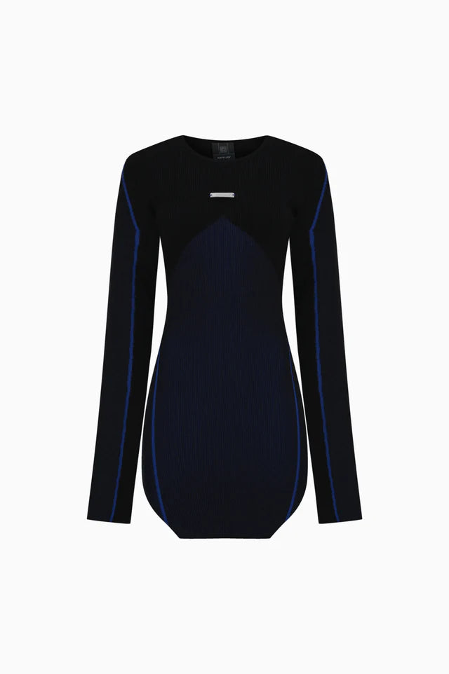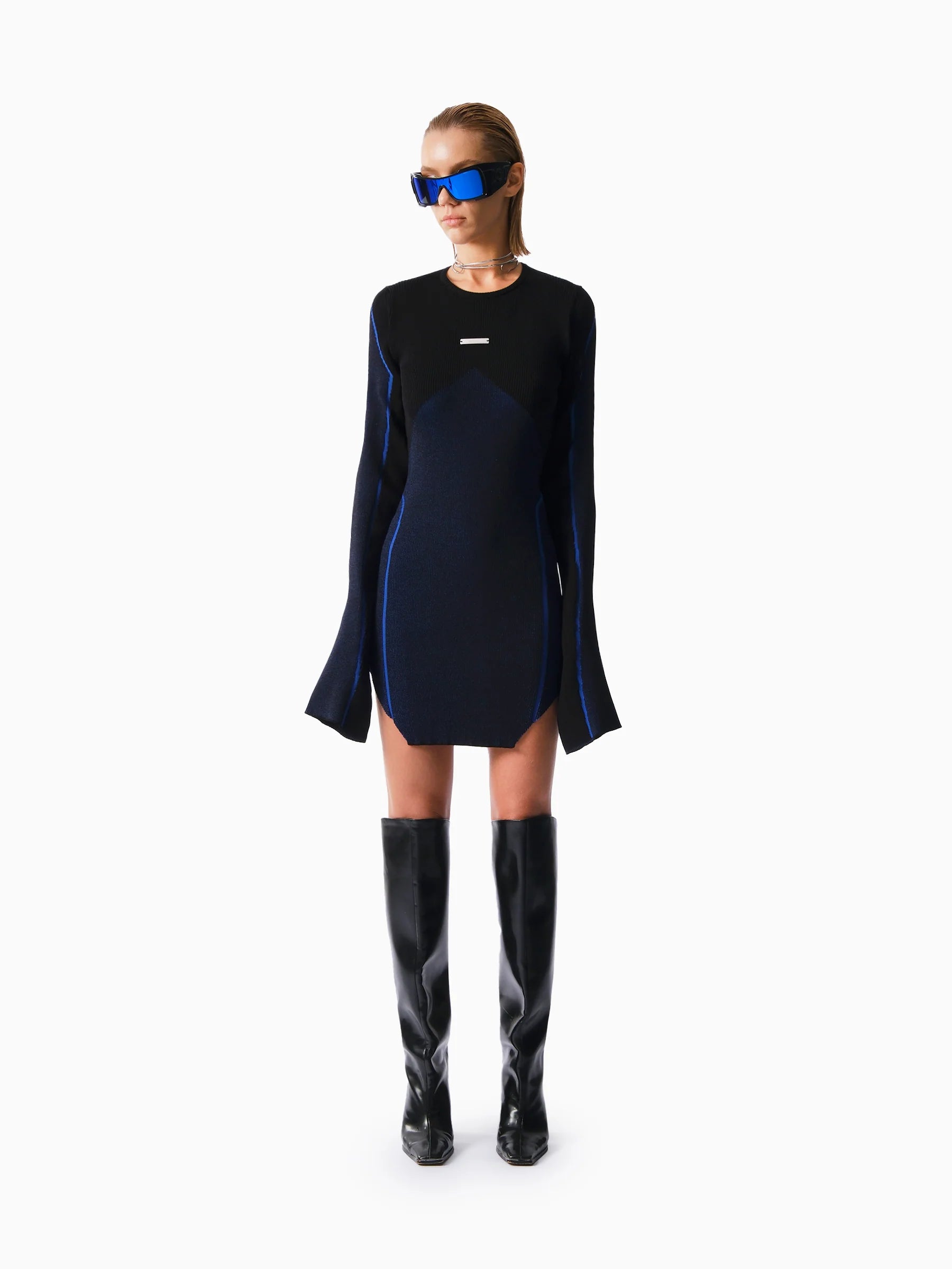 Lacivert uzun kollu, kontrast kontur detaylı bodycon triko mini elbise.