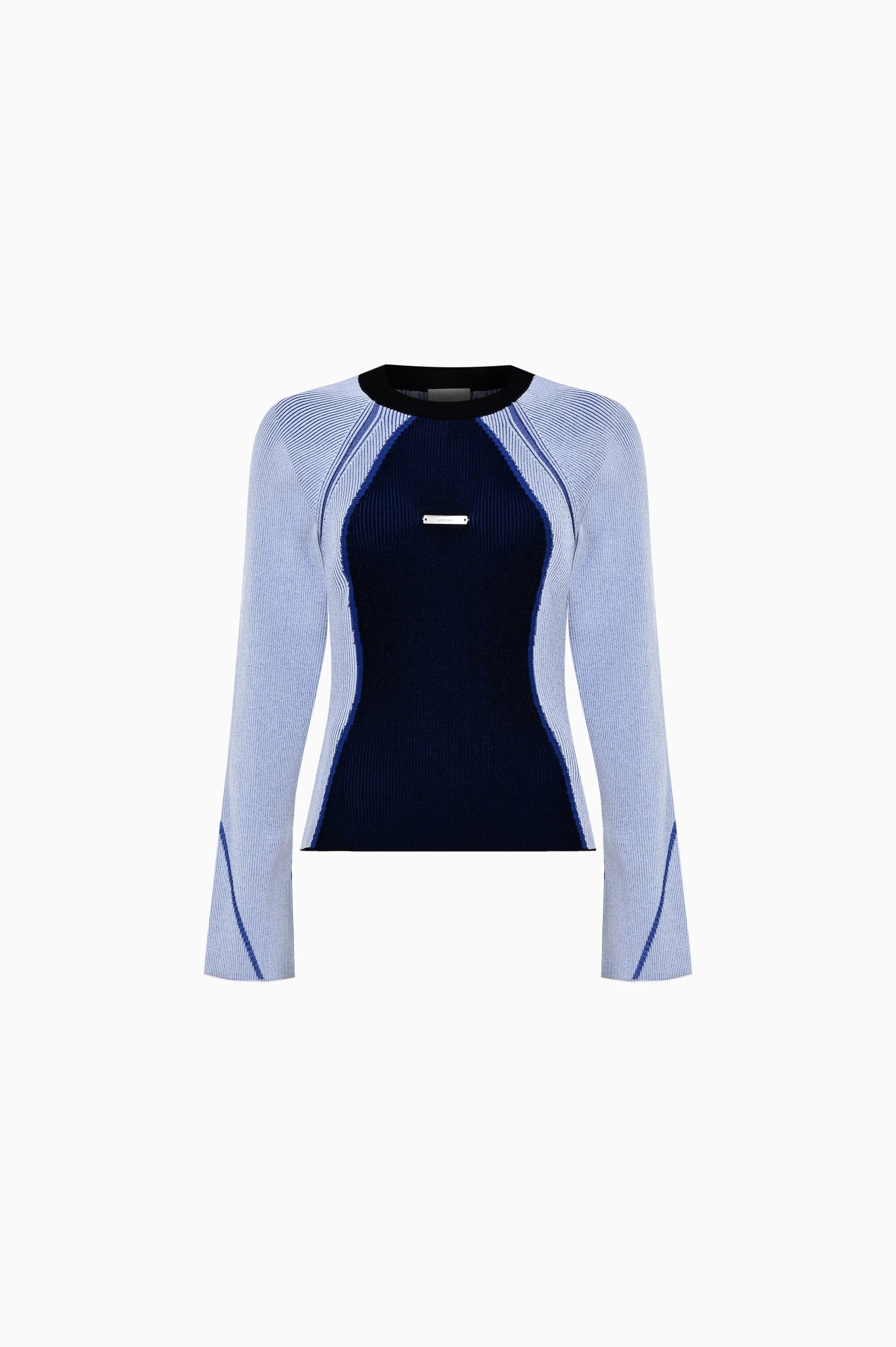 Lacivert ve açık mavinin iki tonuyla tasarlanmış, panelli uzun kollu triko top.