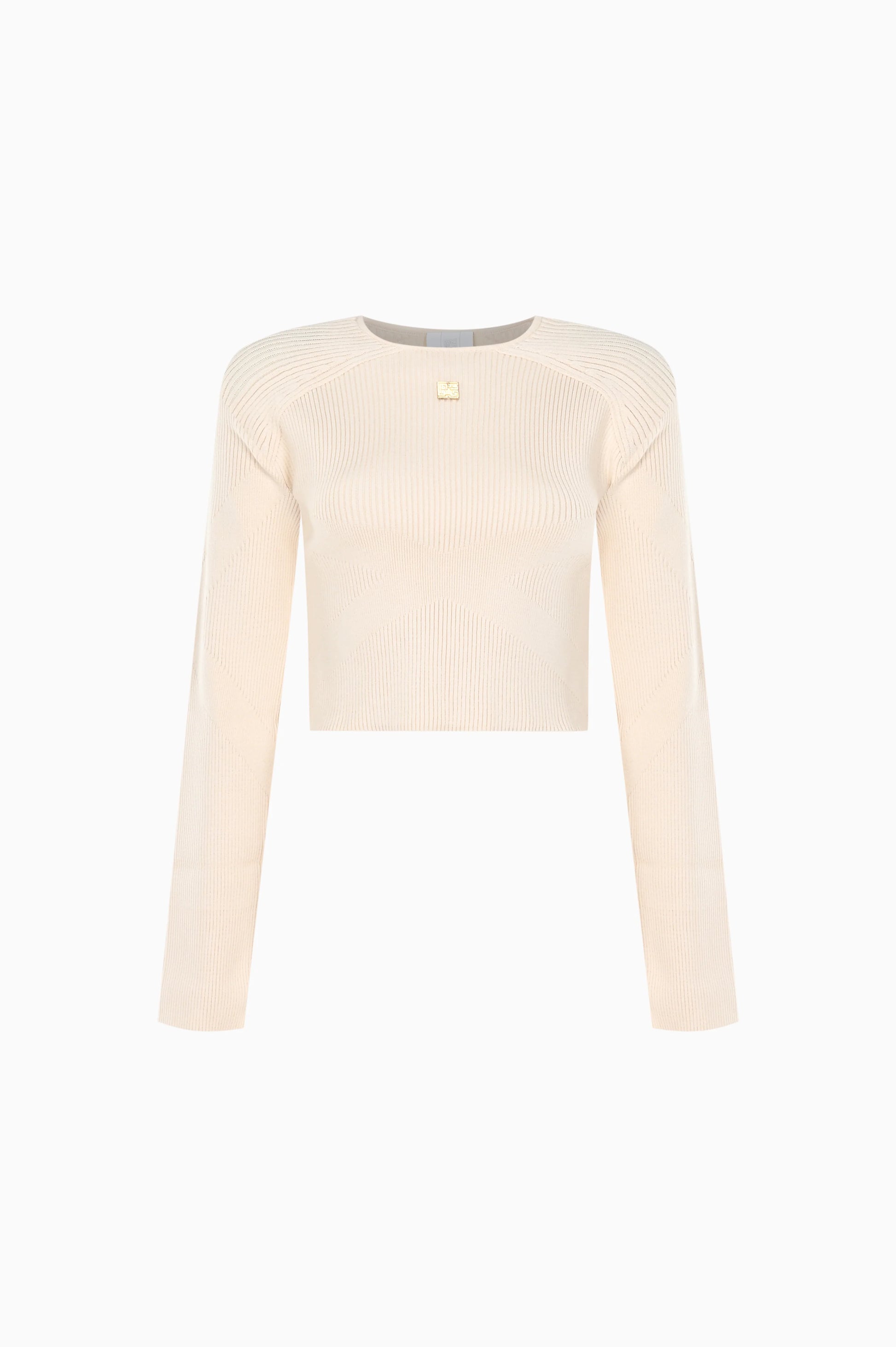 Uzun kollu ve göğüs kısmında ince logo detayları bulunan bej rengi nervürlü kısa örgü üst.