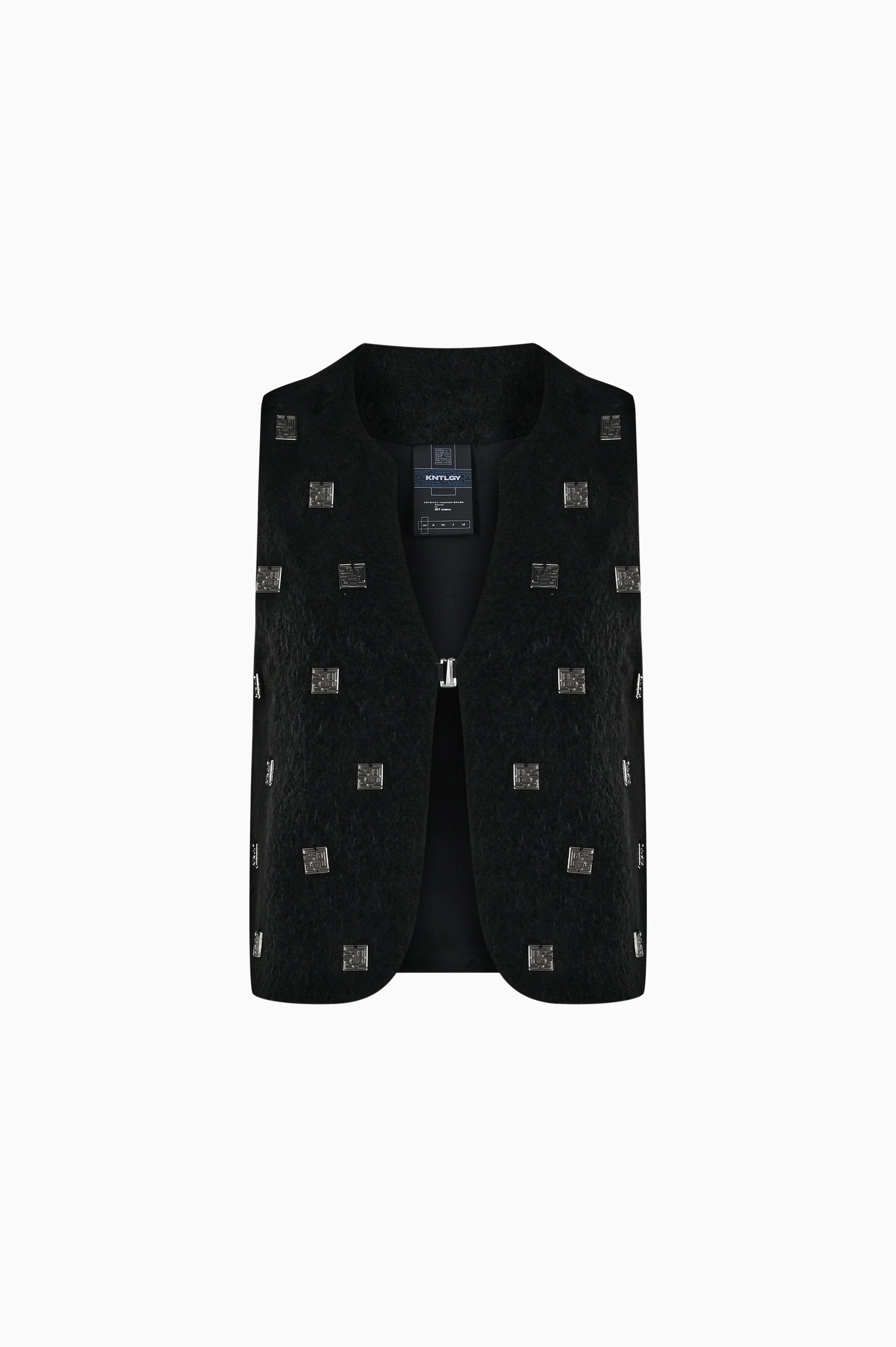 Metalik kare aplikeler ve önden kanca kapama detaylı siyah kolsuz yelek.