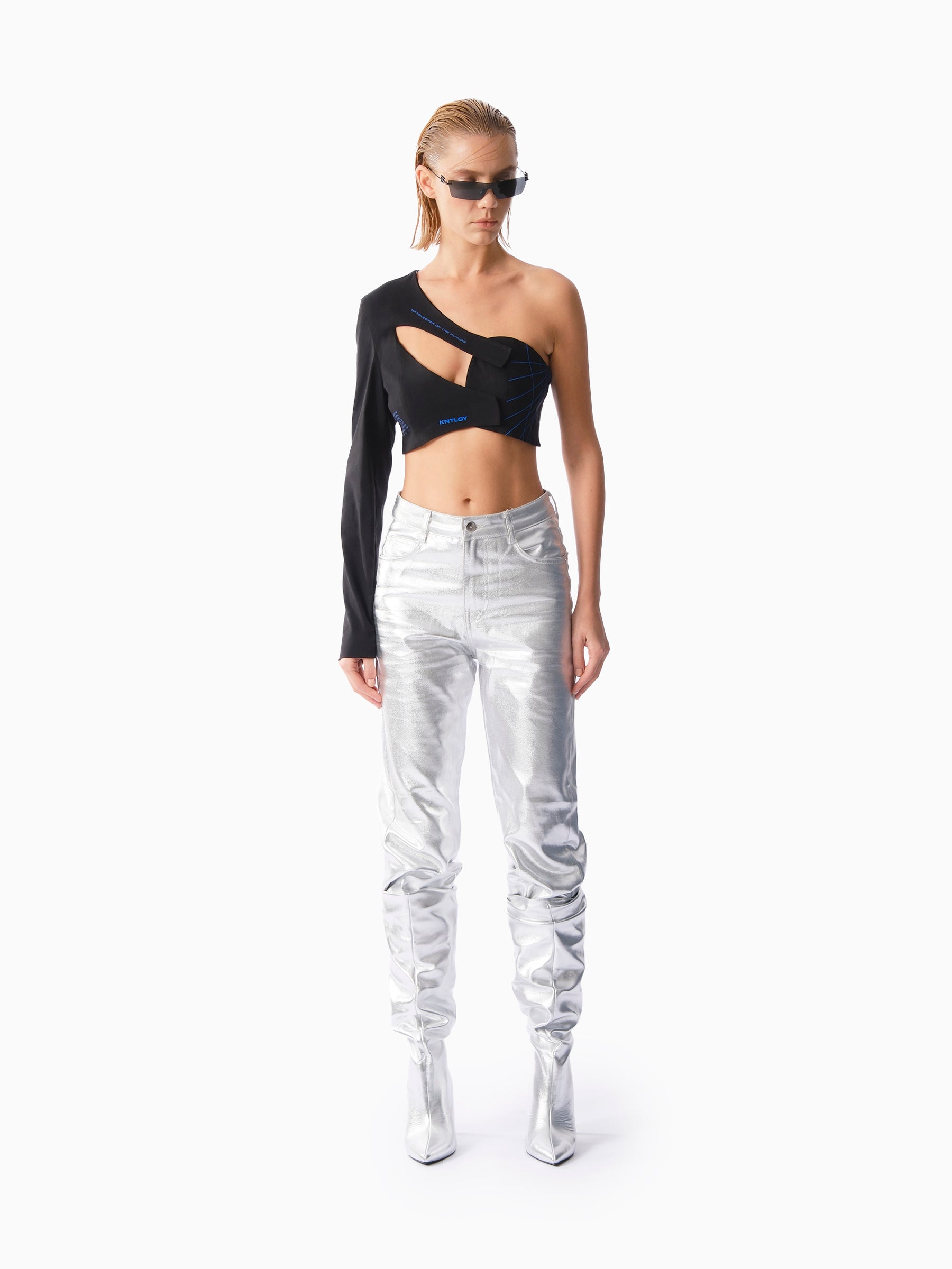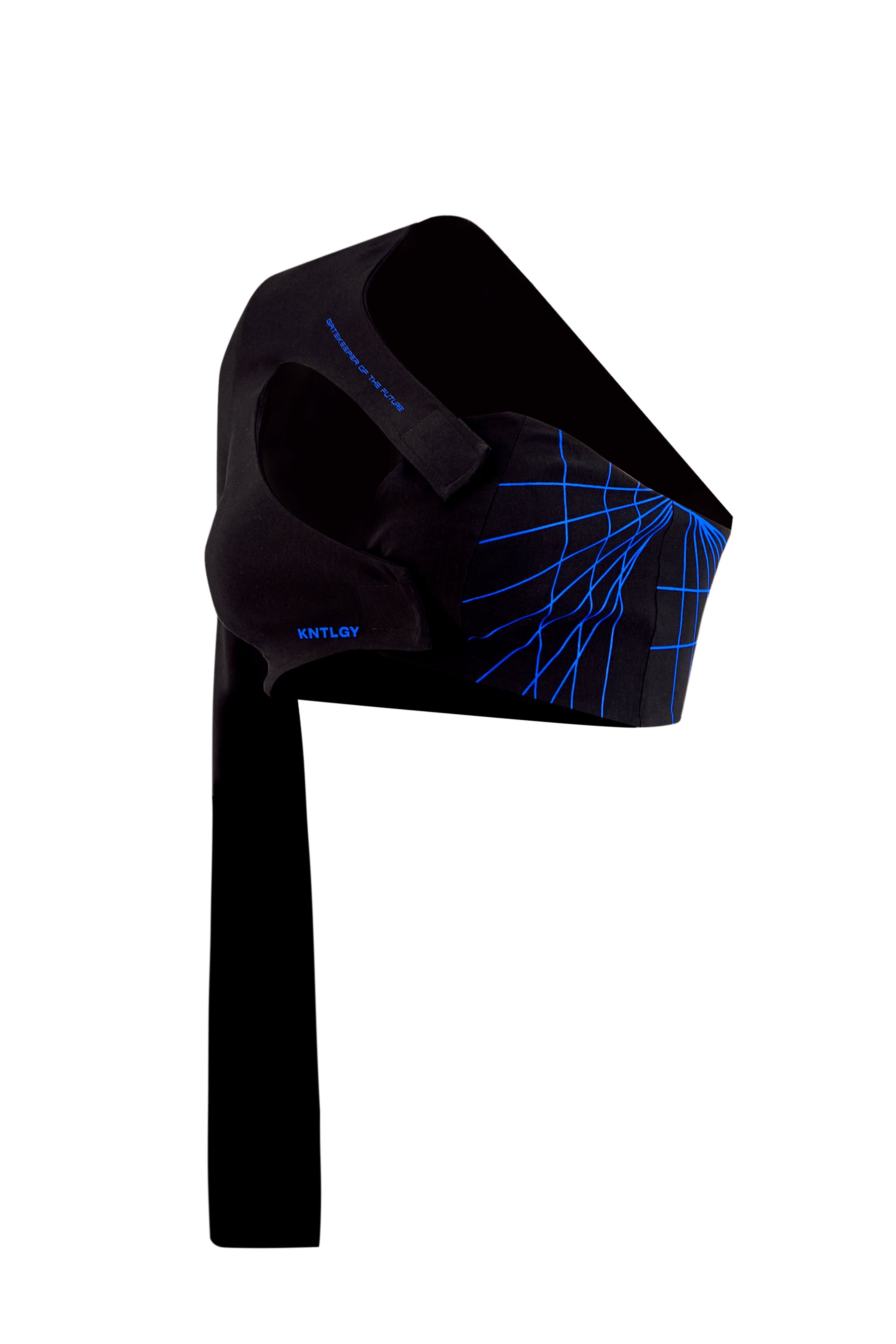 Asimetrik, göğüs dekolteli, çarpraz kapama ayrıntılı, tek kollu, KNTLGY logo ve desen baskılı crop top.
