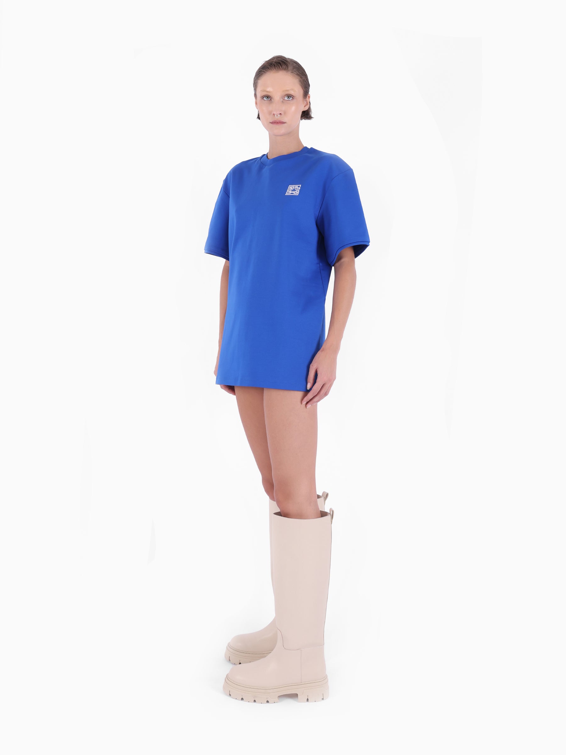 Bisiklet yaka, KNTLGY logo işlemeli, oversize Türk deniz mavisi T-shirt.