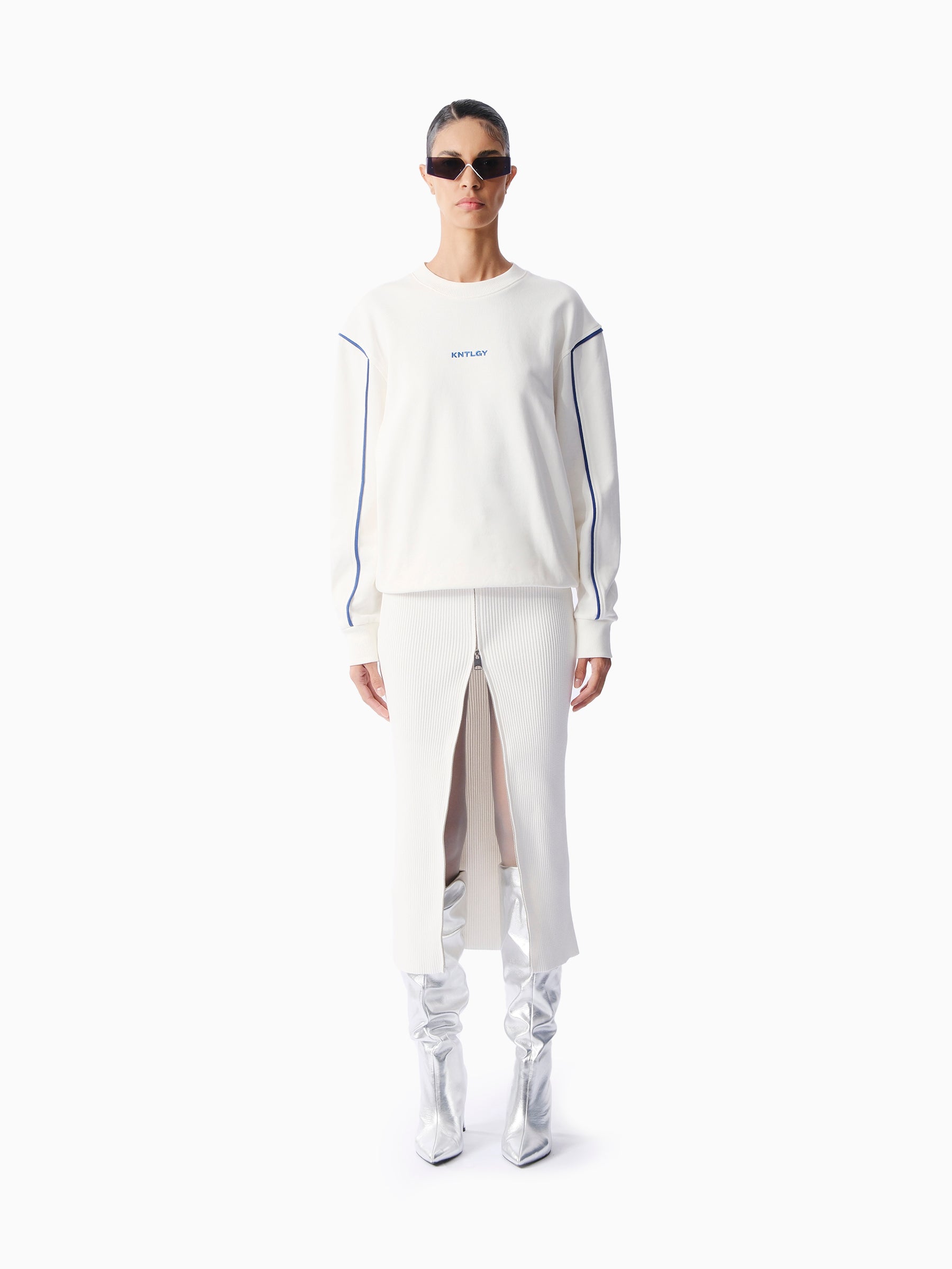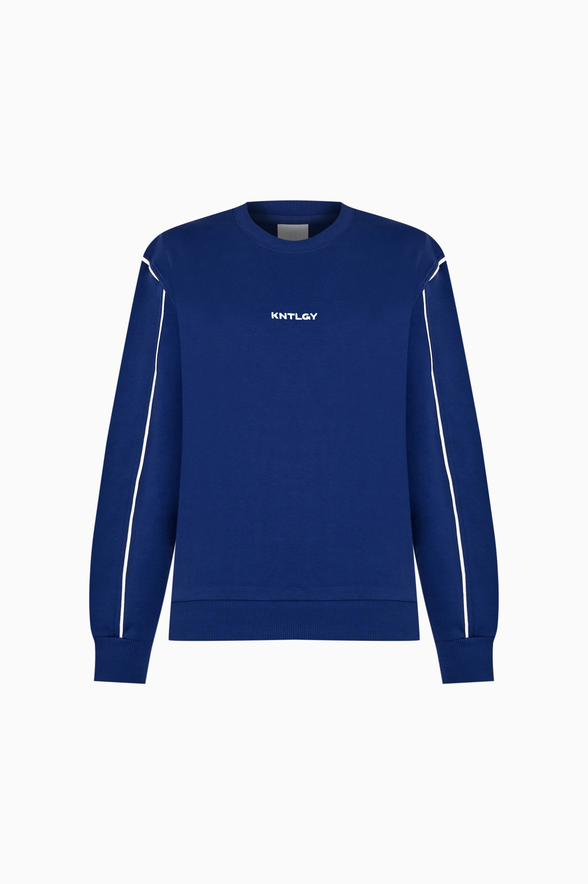 Bisiklet yaka, uzun kollu, kontrast beyaz şerit detaylı, ön kısmı KNTLGY nakış detaylı, pamuklu, mavi unisex sweatshirt.