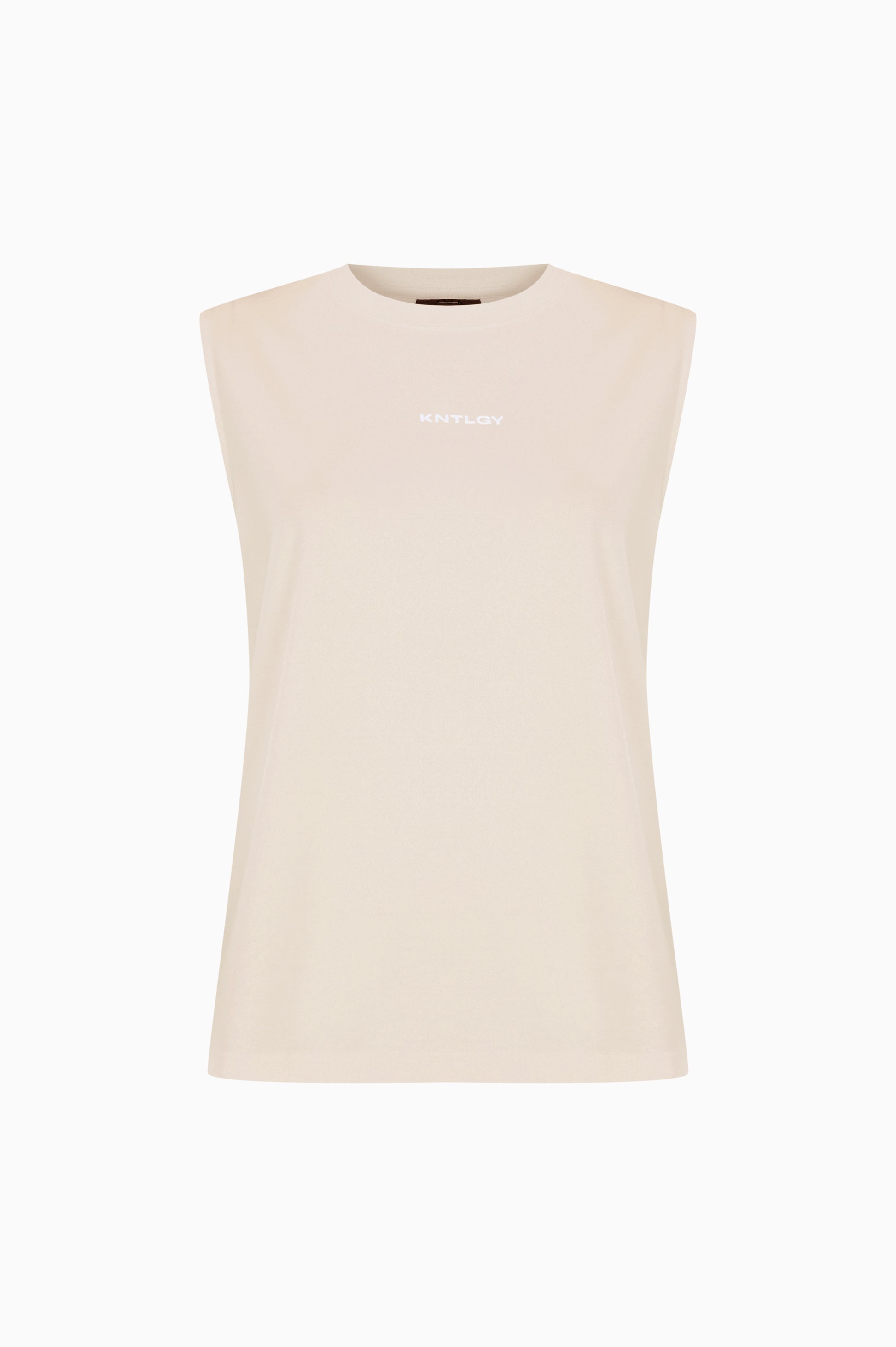 Bisiklet yaka, sıfır kol, rahat kalıp, KNTLGY baskılı, merserize pamuklu beyaz T-shirt.