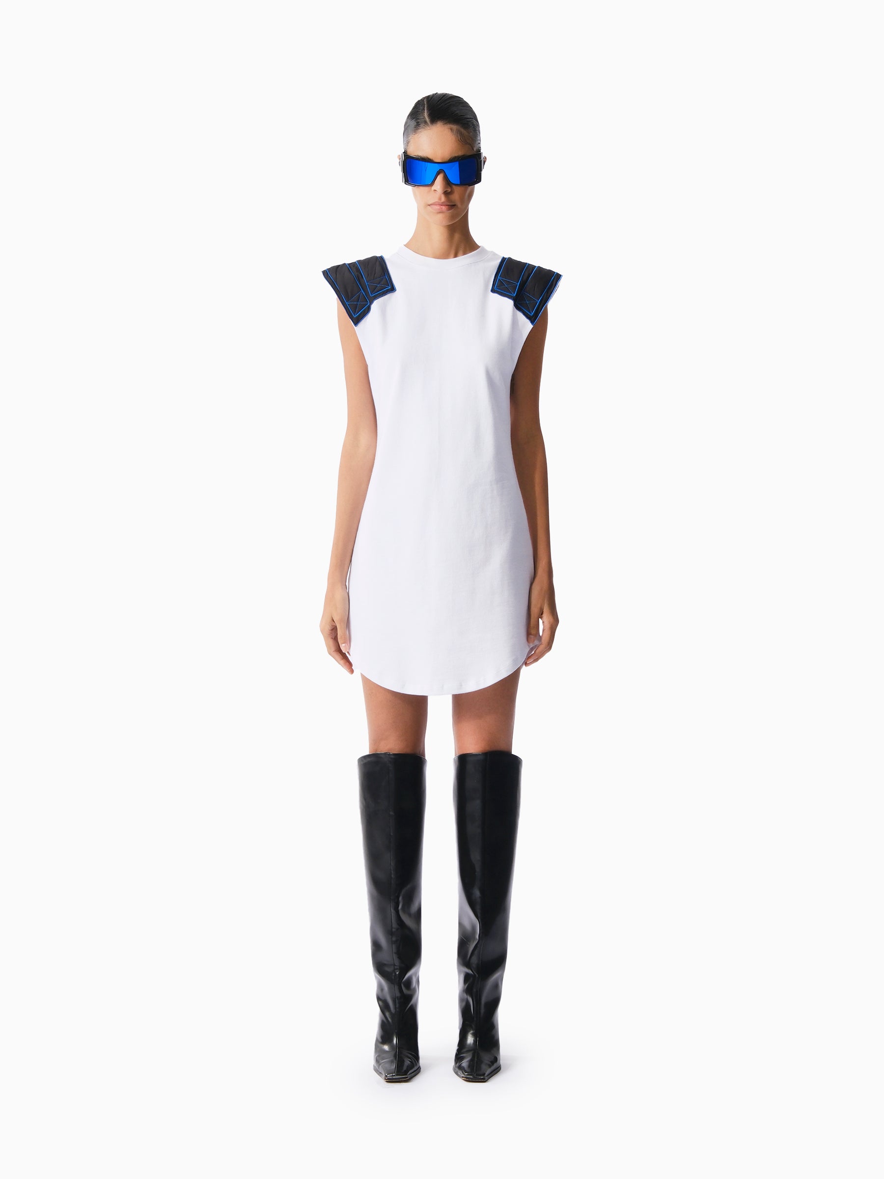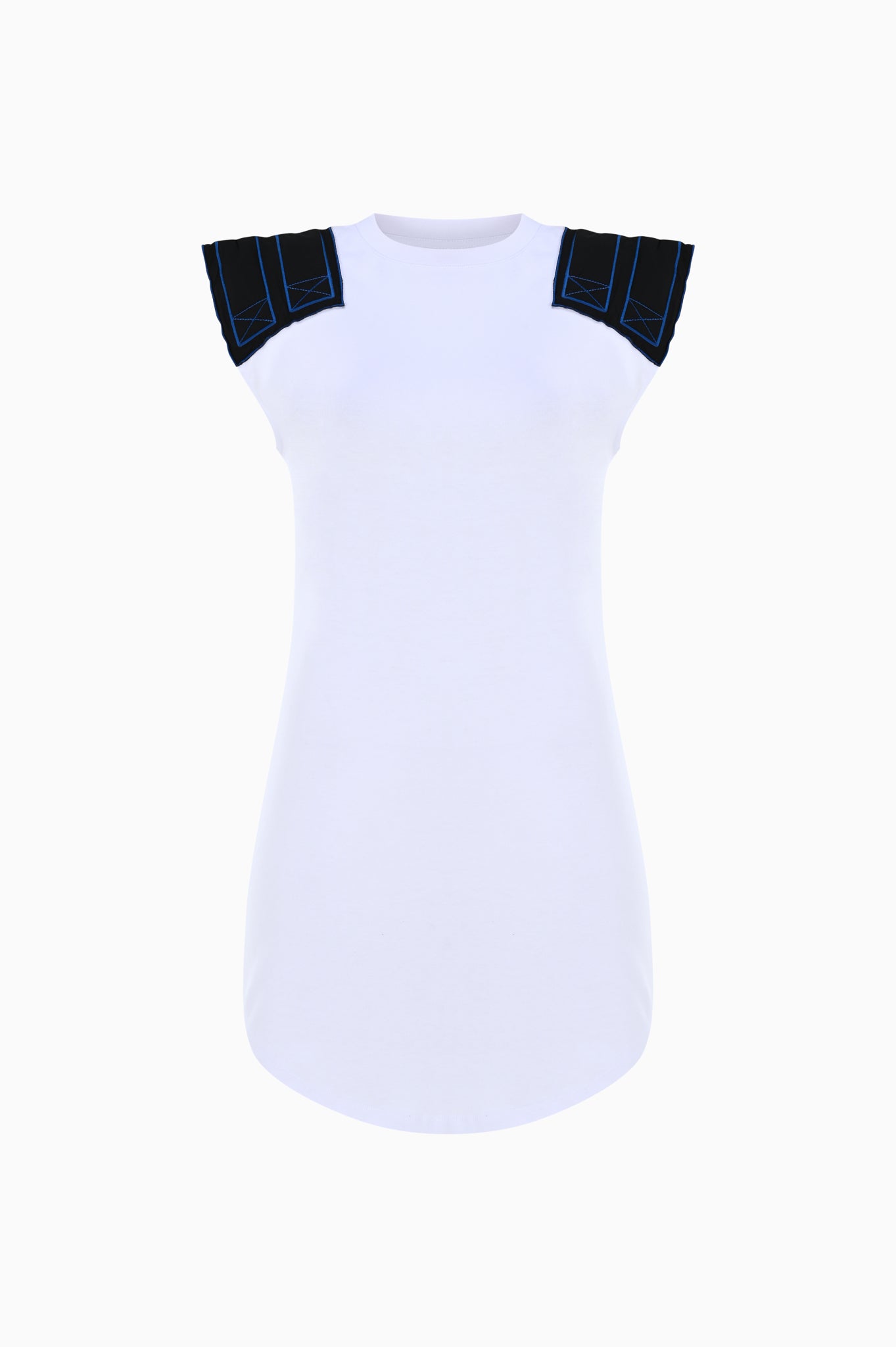 Omuzları siyah tafta kumaş, mavi dikiş detaylı, bisiklet yakalı, kolsuz, beyaz mini elbise.