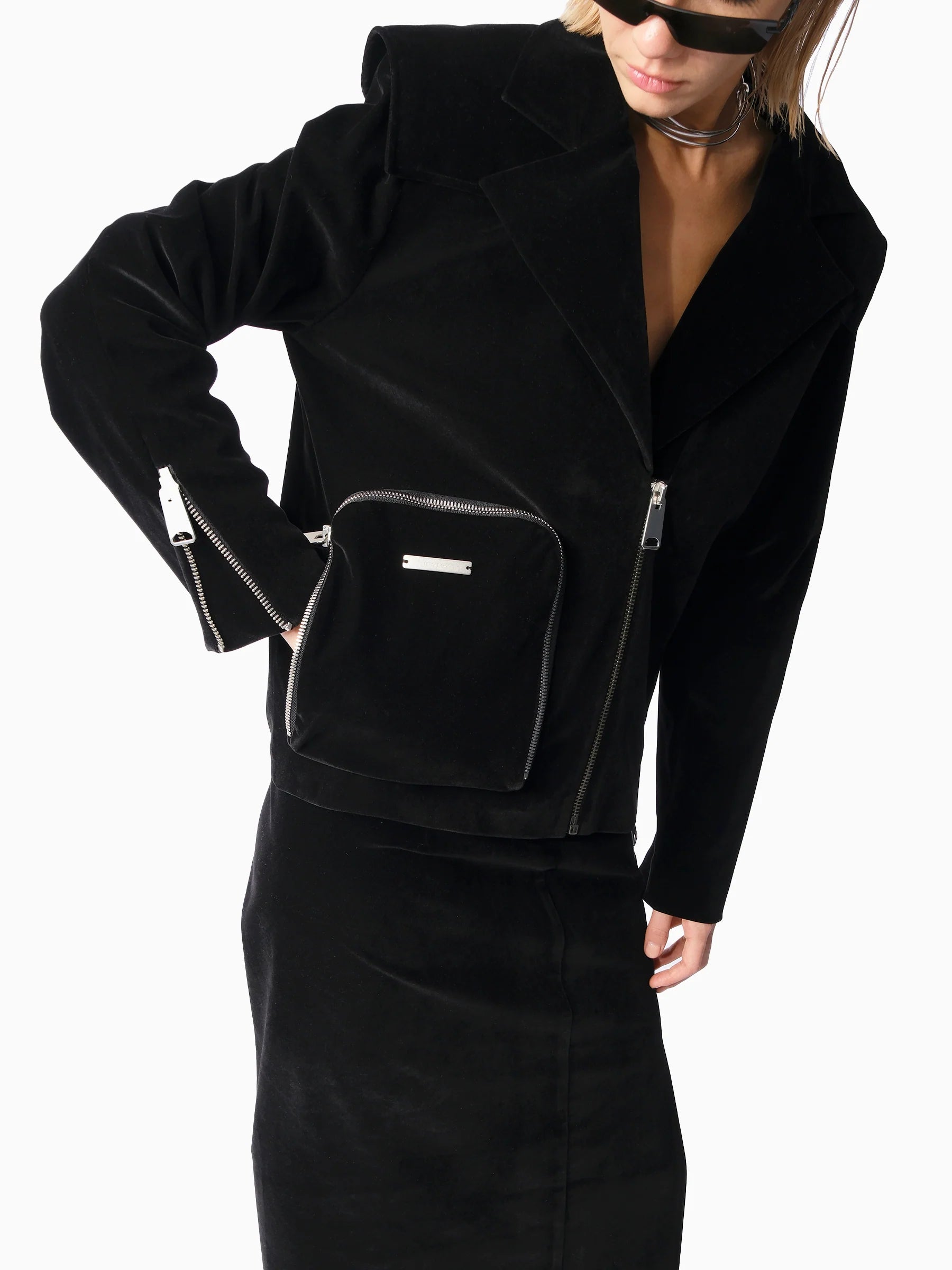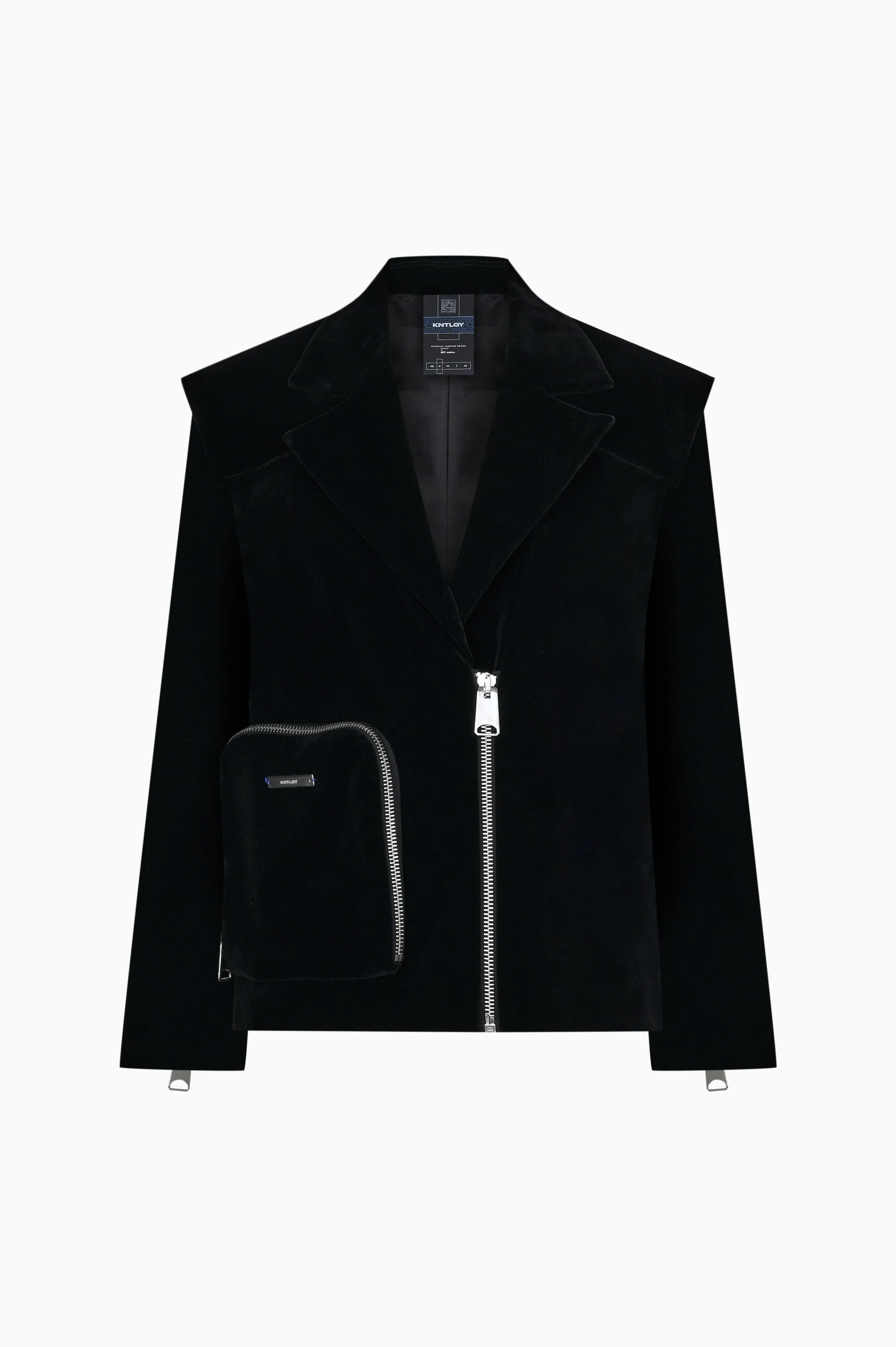 Klasik yakalı, fermuarlı cep detaylı siyah kadife ceket.