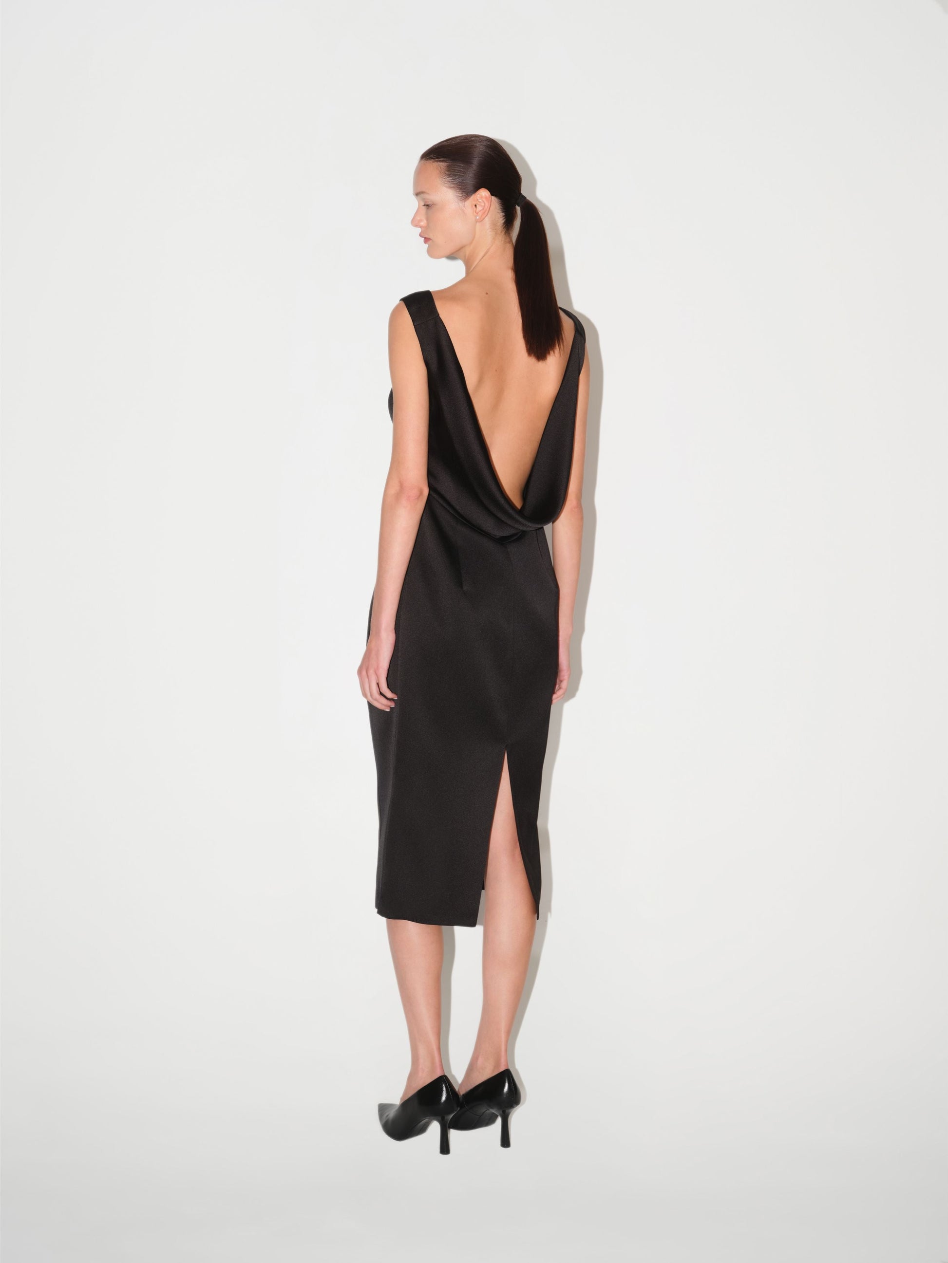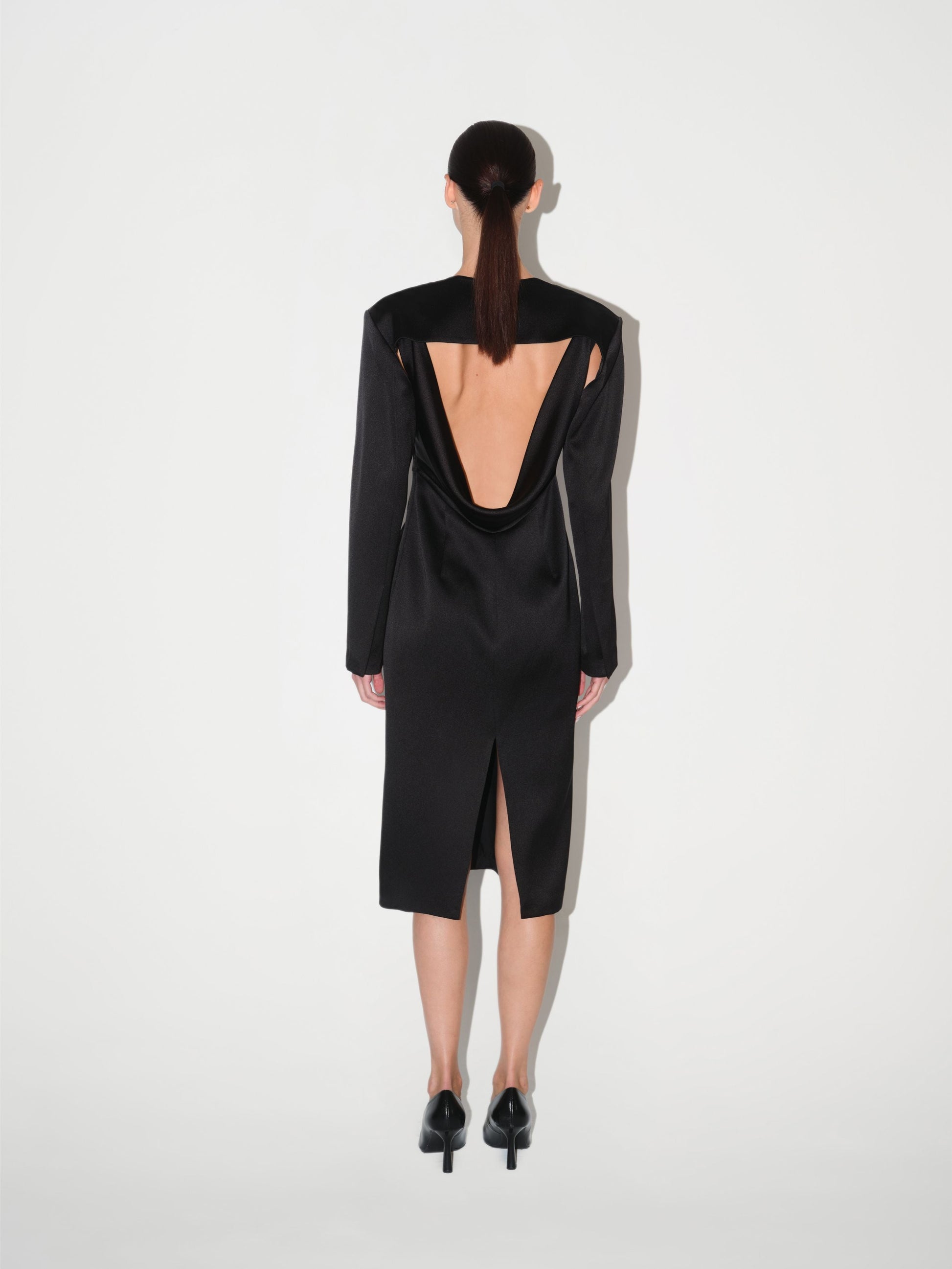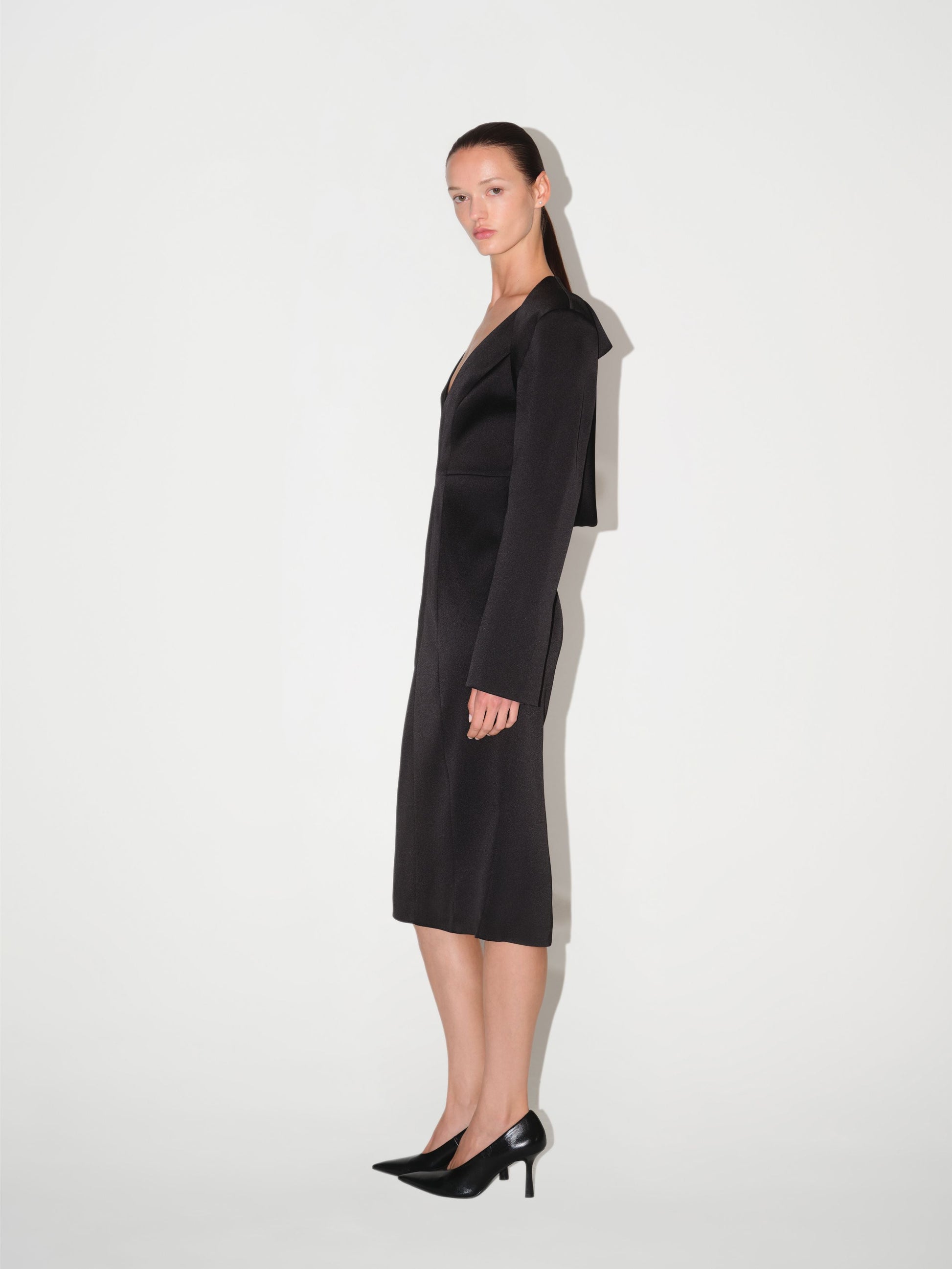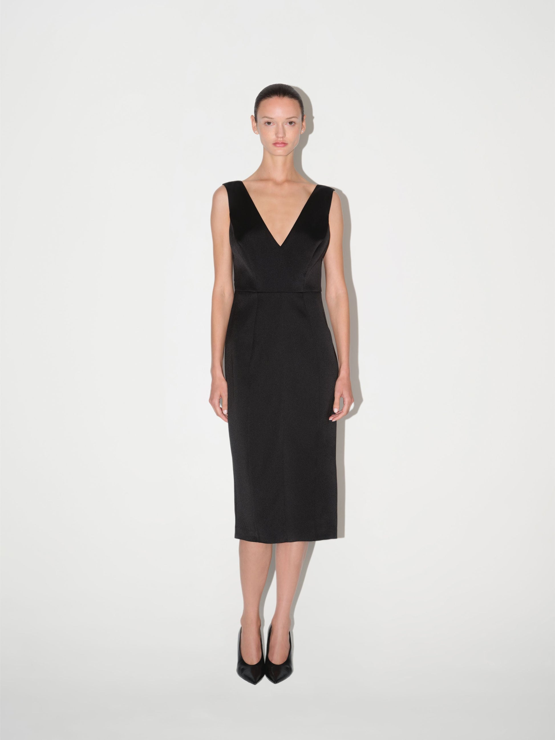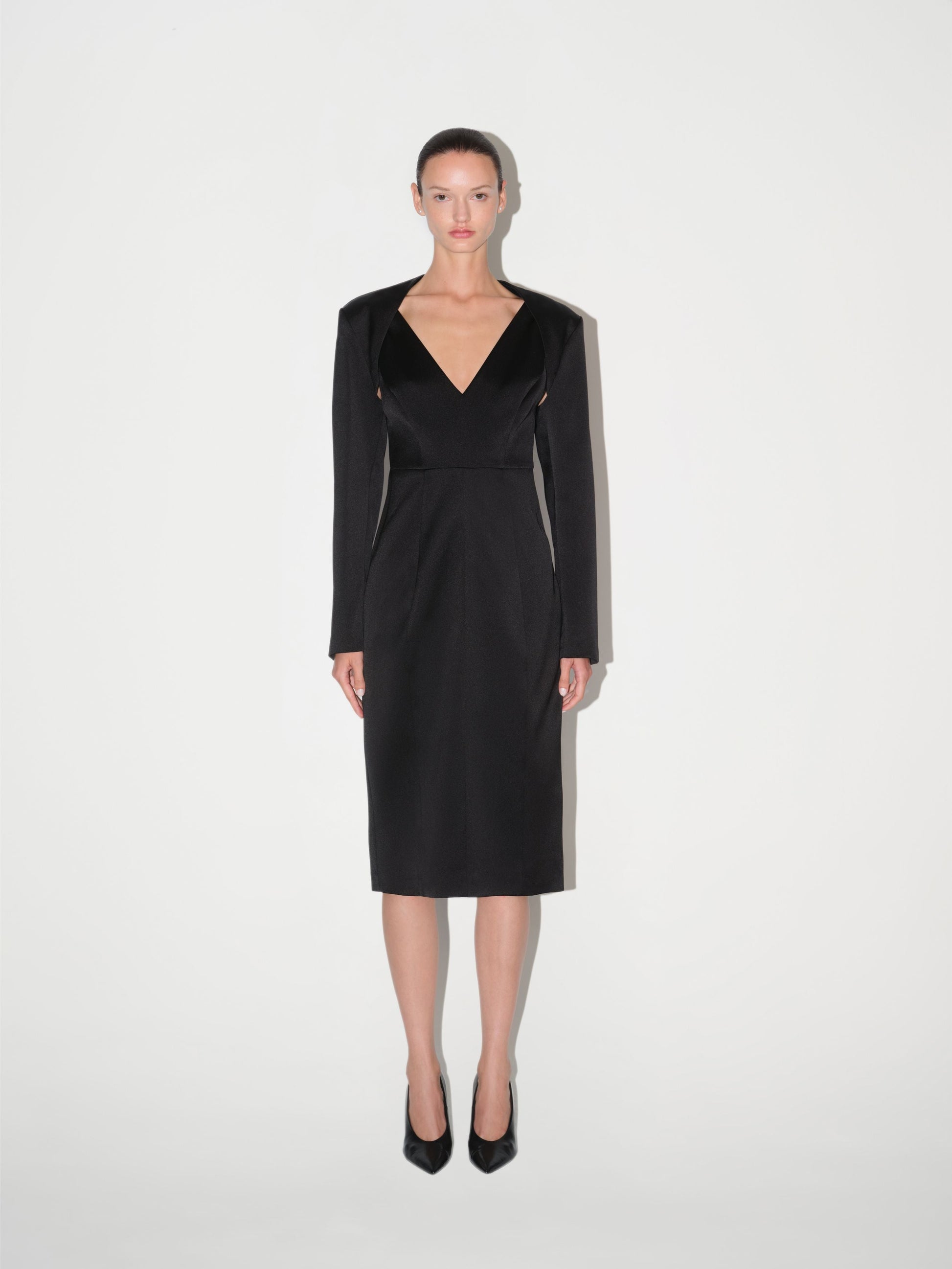 Siyah renkte, midi boy elbise modelidir. V yaka tasarımına ve vücuda oturan kalem elbise (pencil skirt) kesimine sahiptir. Elbisenin sırt kısmında derin V şeklinde bir dekolte bulunur.