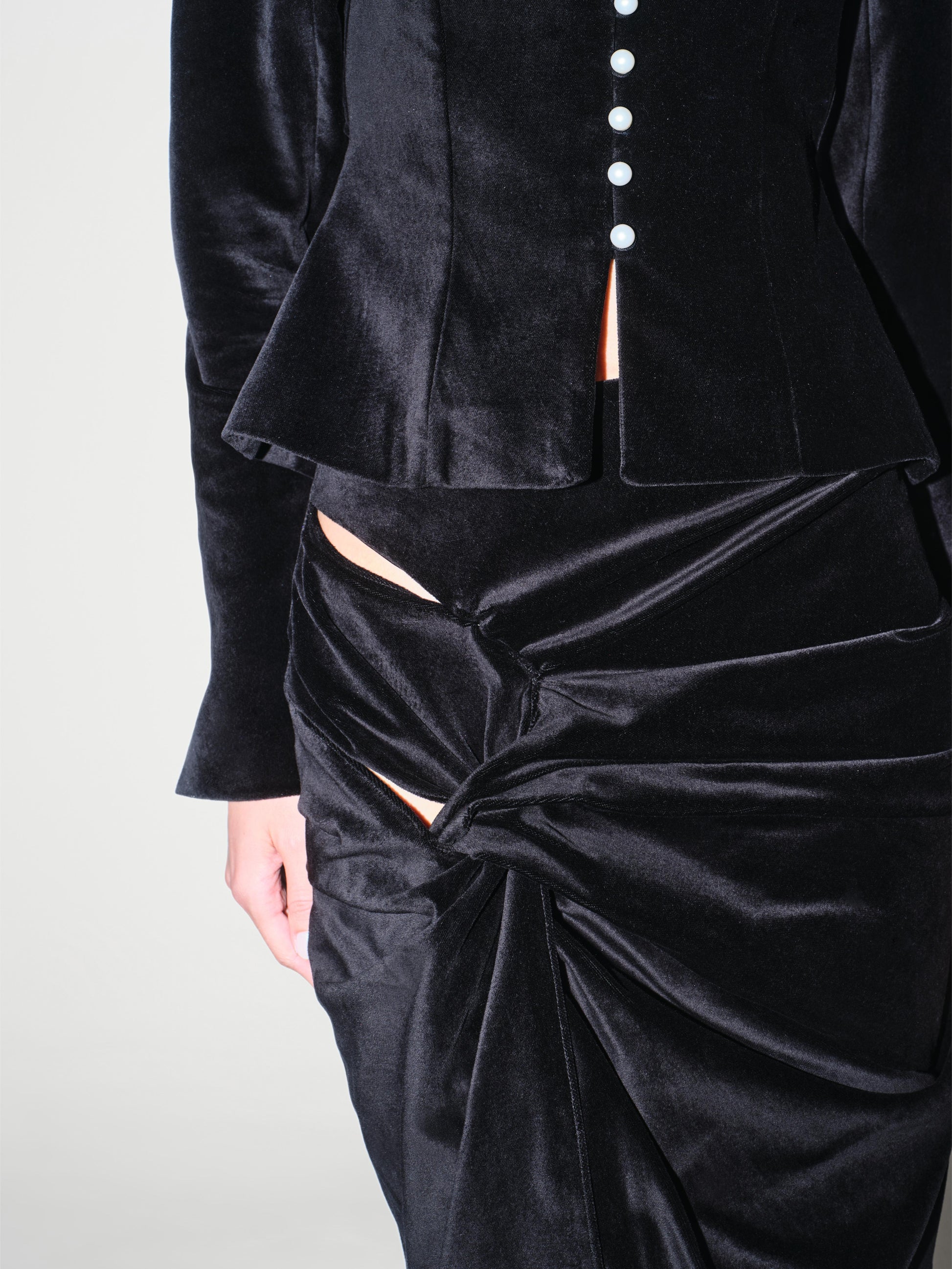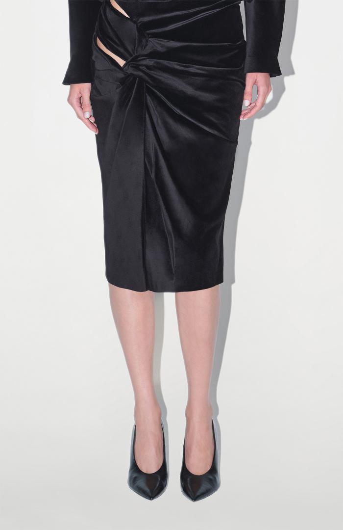Siyah renkte, yüksek bel etek modelidir. Kumaşı kadife ve yumuşak ve parlak bir dokuya sahiptir. Kesimi diz hizasında midi boy uzunluğundadır ve vücuda oturan kalem etek (pencil skirt) tarzındadır. Eteğin ön kısmında drapaj (büzgü) ve düğüm detayı kullanılmıştır. Bu düğümün hemen üzerinde ve altında üçgen kesimli dekolte veya yırtık detayları yer alır. Yan dikişte ise yüksek yırtmaç detayı bulunur. Arka kısmı sade, düz ve yırtmaçsızdır.
