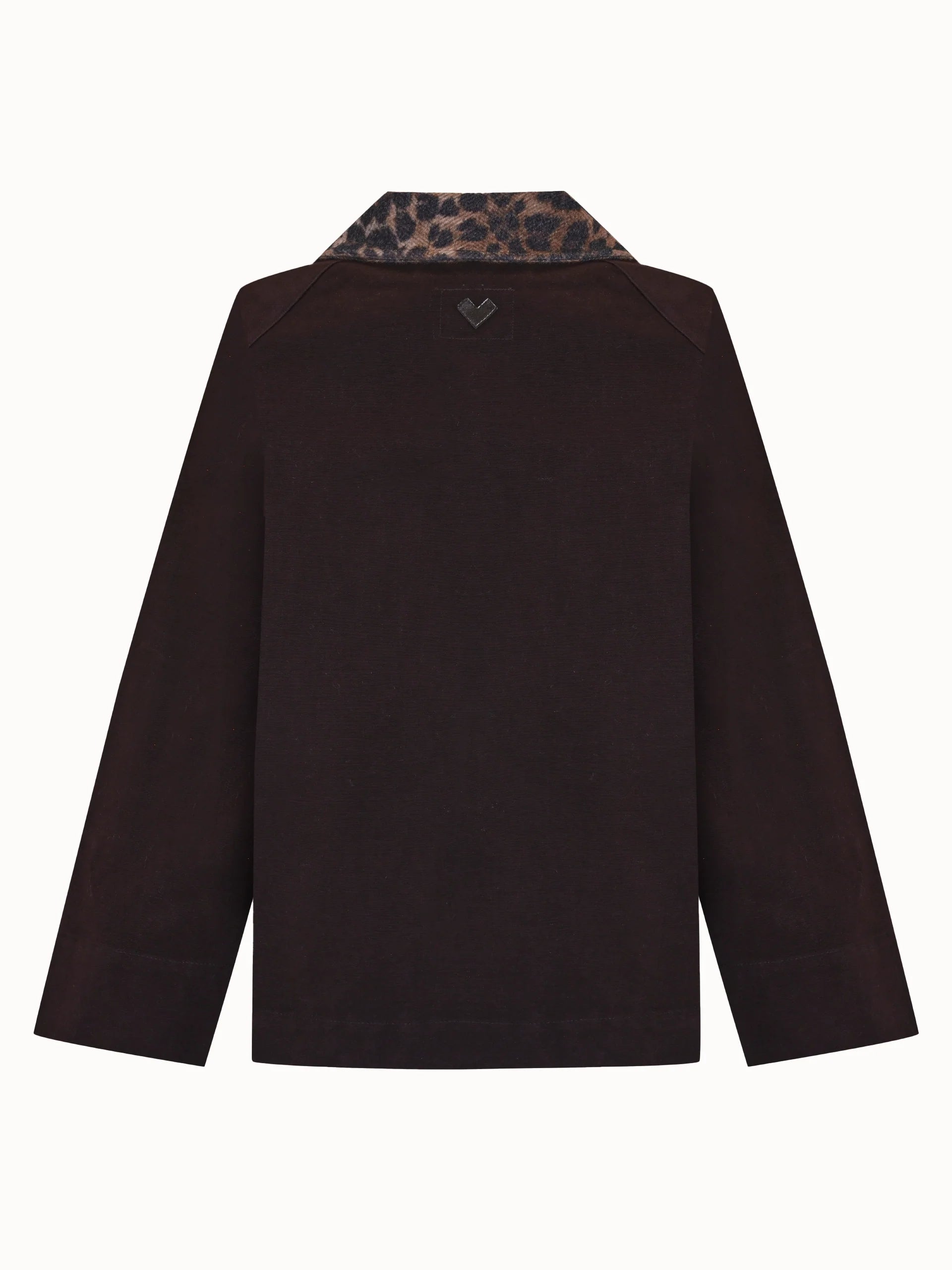 Detaylar: Leopar desenli yaka, gizli düğmeli kapama, kapaklı yama cepler, düz ve geniş kol, arka yaka altında siyah kalp logo