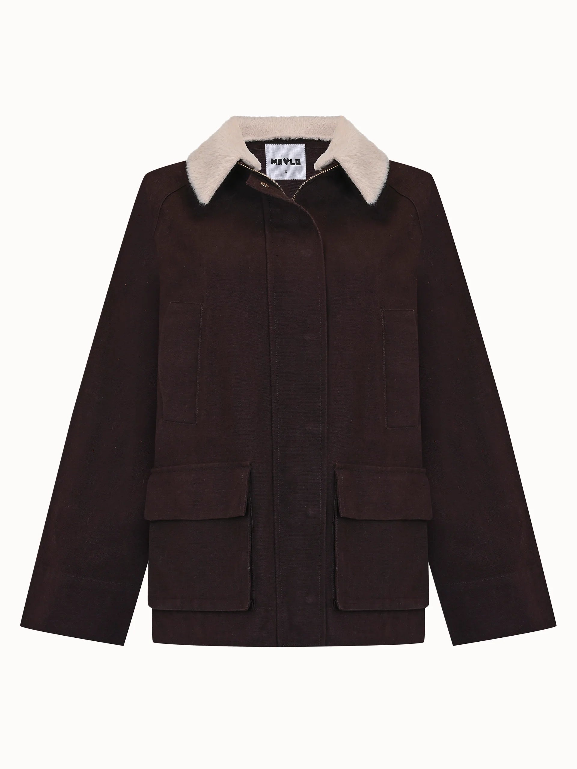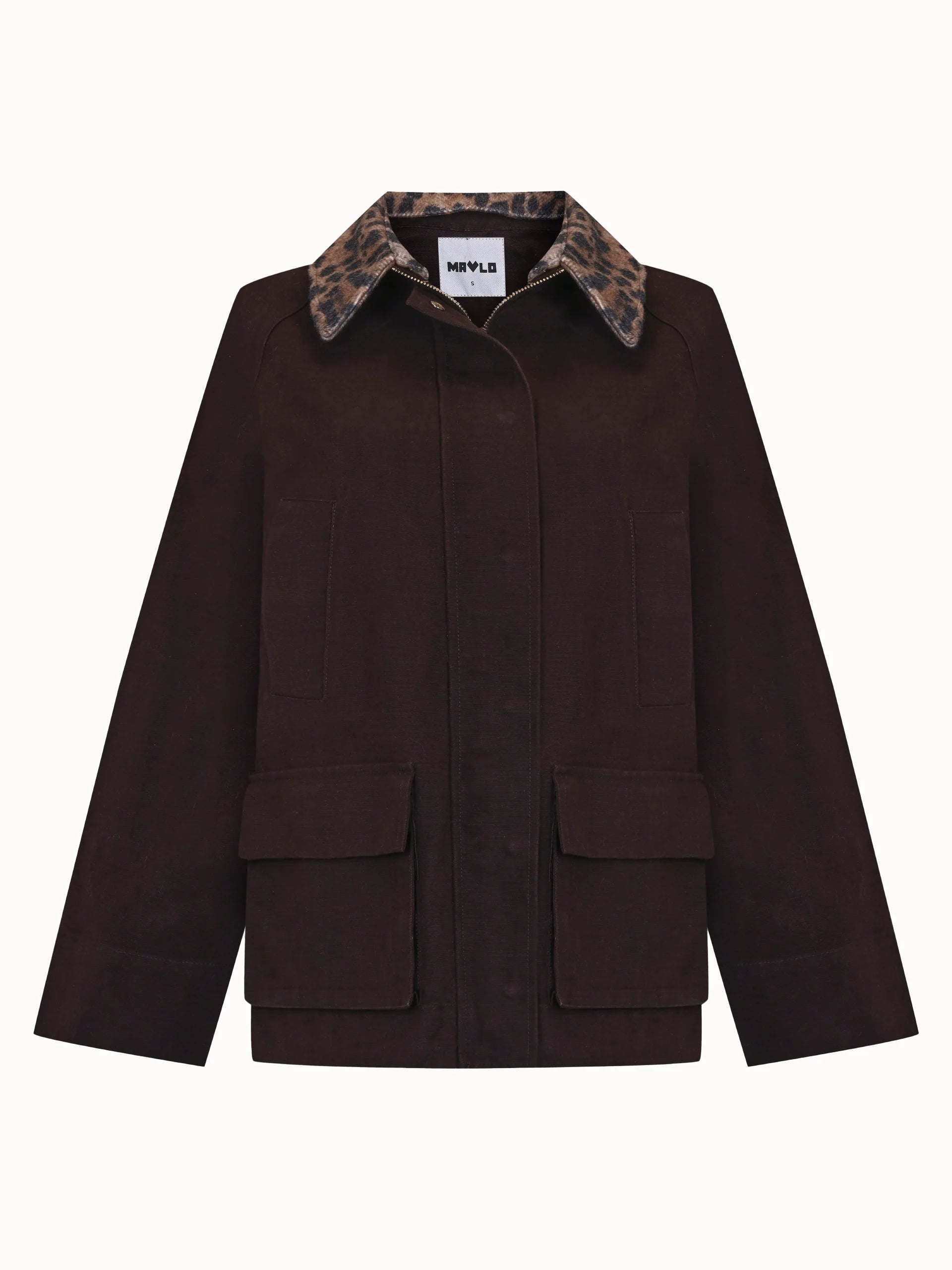 Koyu kahverengi tonlarında, uzun kollu ceket modelidir. Klasik gömlek yaka tasarımına sahiptir; yaka kısmı leopar desenli farklı bir kumaşla kaplanmıştır. Ön ortadan gizli patlet altında yer alan düğmelerle kapanır. Genel kesimi oversize ve rahat bir kalıba sahiptir. Ön yüzeyde bel hizasında iki adet kapaklı büyük cep detayı ve üst kısımda dikişsiz gizli cepler yer alır. Kollar düz ve geniş kesimlidir. Arka kısımda yaka altında siyah, kalp şeklinde bir logo detayı bulunur.