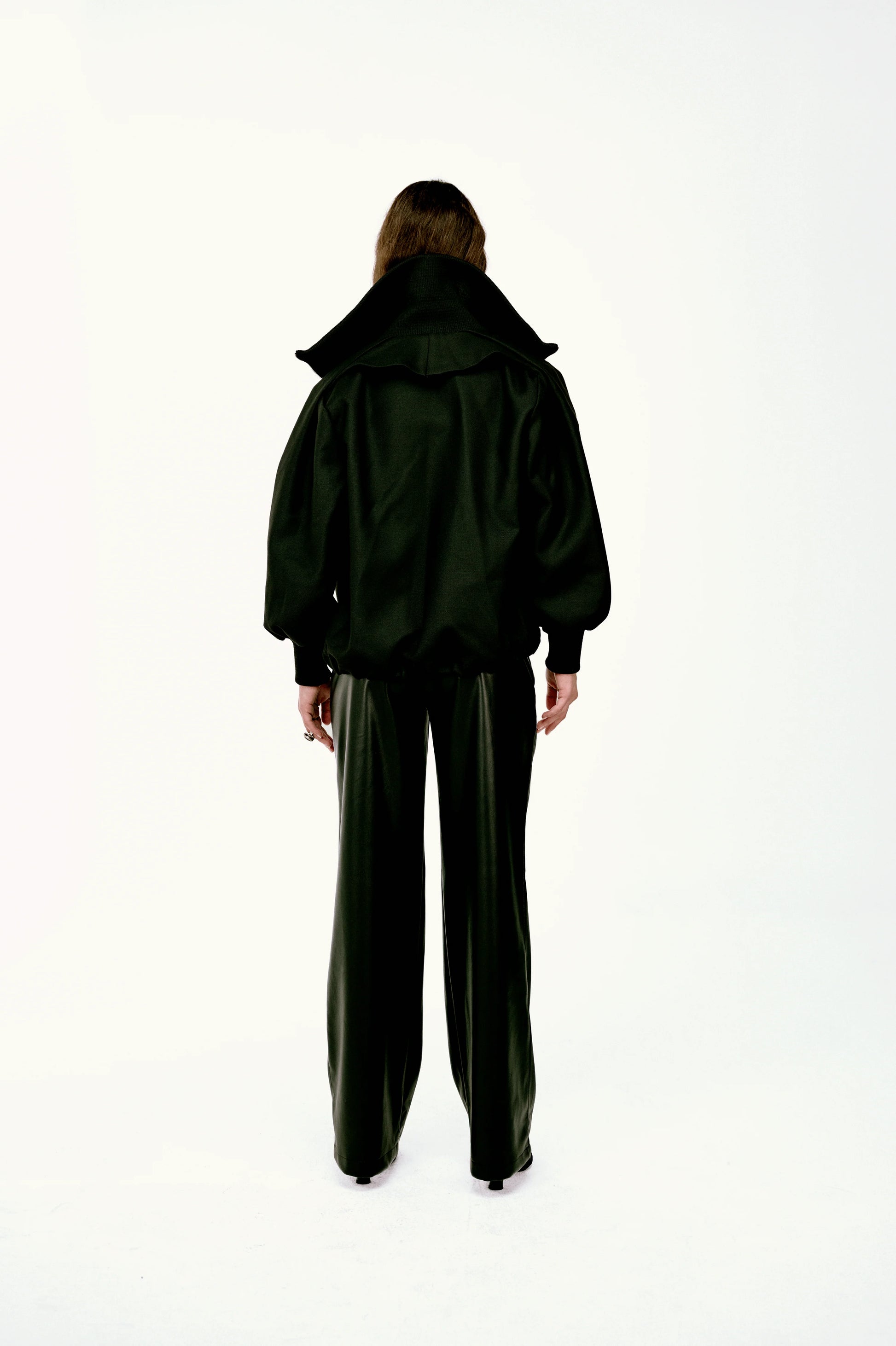 Siyah renkte, uzun kollu, geniş ve dik yaka detayına sahip, fermuarlı ceket modelidir. Kumaşı mat ve tok yapılı, kalın dokulu bir kumaştır (yün, kalın gabardin veya keçe benzeri). Kesimi kısa (crop) boyda, gövde kısmı düz, kolları ise hacimli ve balon formdadır (puff sleeves). Yaka kısmı giyildiğinde boyun ve omuzları saran, büyük ve dik bir duruş sergiler. Önü metal bir fermuar ile kapanır. Kol ağızları (manşetler) ve etek ucu kalın ribana (lastik) örgü ile tamamlanmıştır.