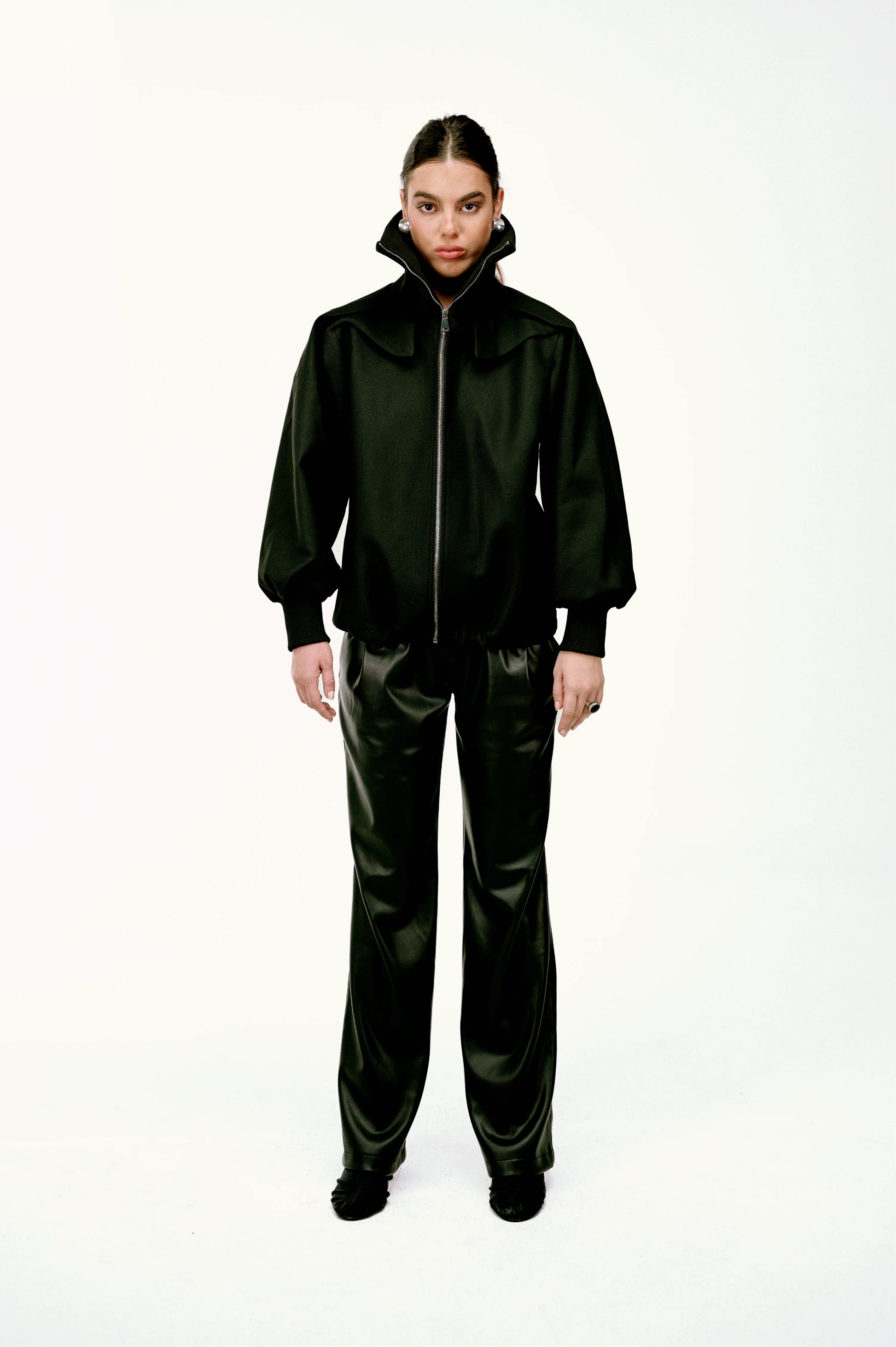 Detaylar: Geniş ve dik yaka, balon/hacimli uzun kollar, fermuarlı ön kapama, ribana manşet ve etek ucu, kısa (crop) kesim.