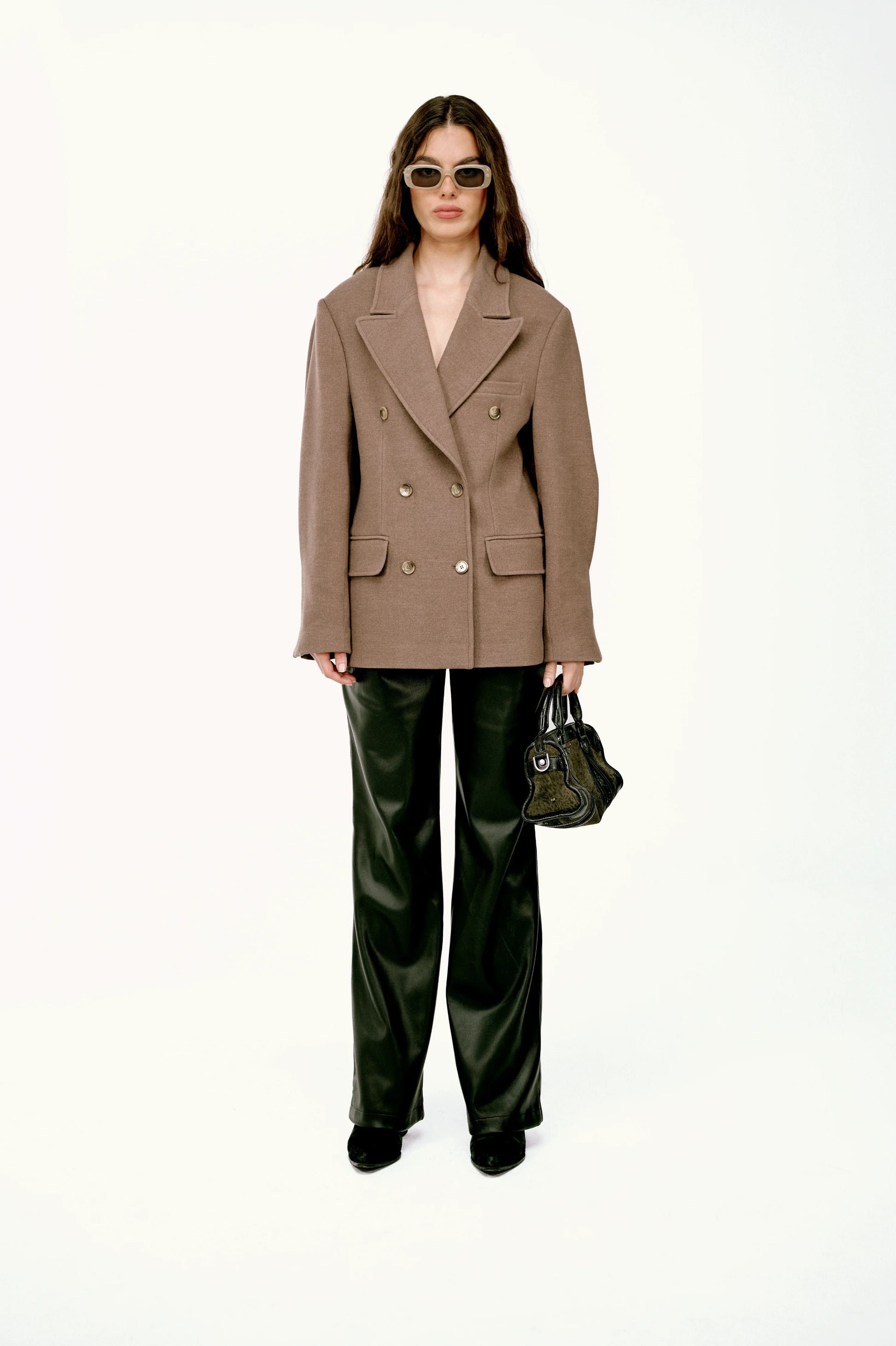 Bej tonlarında, uzun kollu, kruvaze (double-breasted) kesim blazer ceket modelidir. Kumaşı yün veya yün karışımı gibi, kalın, tok ve mat yüzeyli bir kumaştır. Kesimi uzun boyda (kalçayı kapatan), oversize ve vücuttan uzak bir kalıba sahiptir. Yaka kısmı geniş ve sivri uçlu (peak lapel) bir tasarıma sahiptir. Önü çift sıra halinde, küçük ve koyu renkli düğmelerle kapanır. Ceketin ön kısmında kapaklı cepler bulunur. Arka kısmında, bel hizasında iki dikey dikiş patı (kuyruk detayı) yer alır ve bu dikişlerin üzerinde dikey sıralanmış dekoratif küçük düğmeler mevcuttur. Manşetlerde de dört adet düğme detayı bulunur.