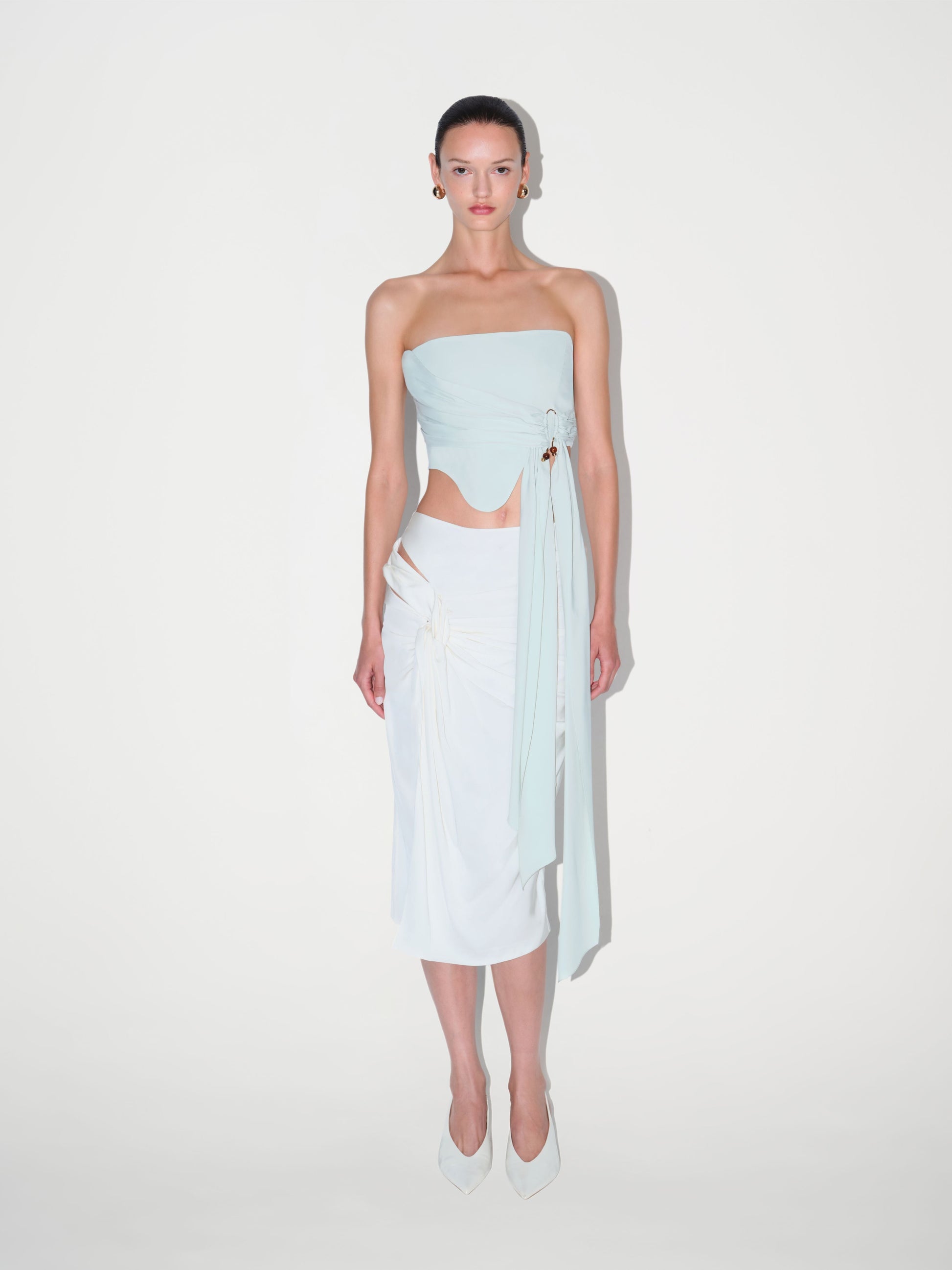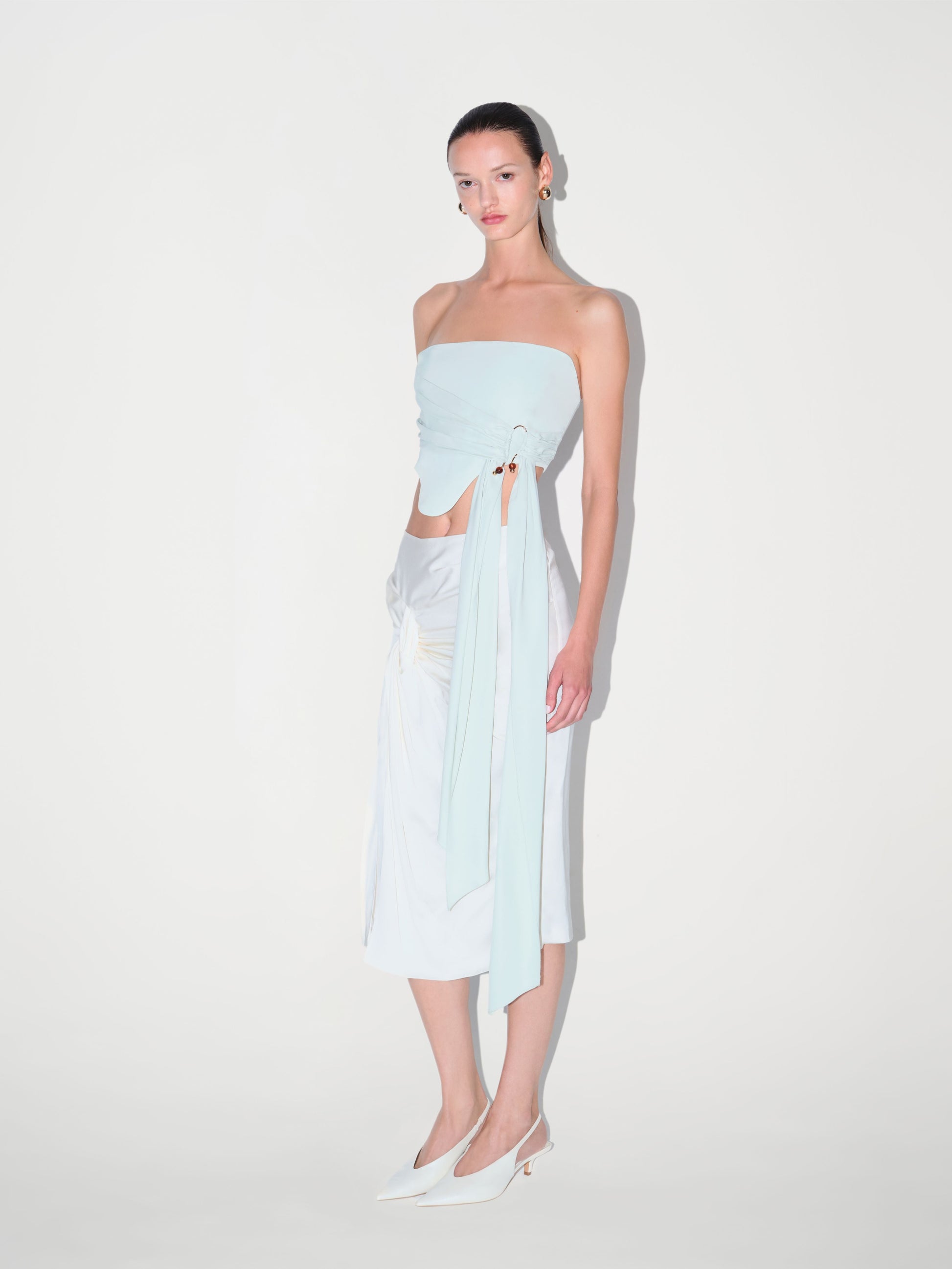 Açık mint yeşili tonlarında, kolsuz kısa kesim (crop) top modelidir. Straplez yaka tasarımına sahiptir. Gövde kısmı sargı (wrap) şeklinde bağlanmış bir görünümdedir ve ön ortada düğüm veya halka detayı ile tutturulmuş uzun kumaş şeritler bulunur. Arka kısmında gizli fermuar kapama mevcuttur. Kumaşı dökümlü ve ipeksi görünümlüdür.