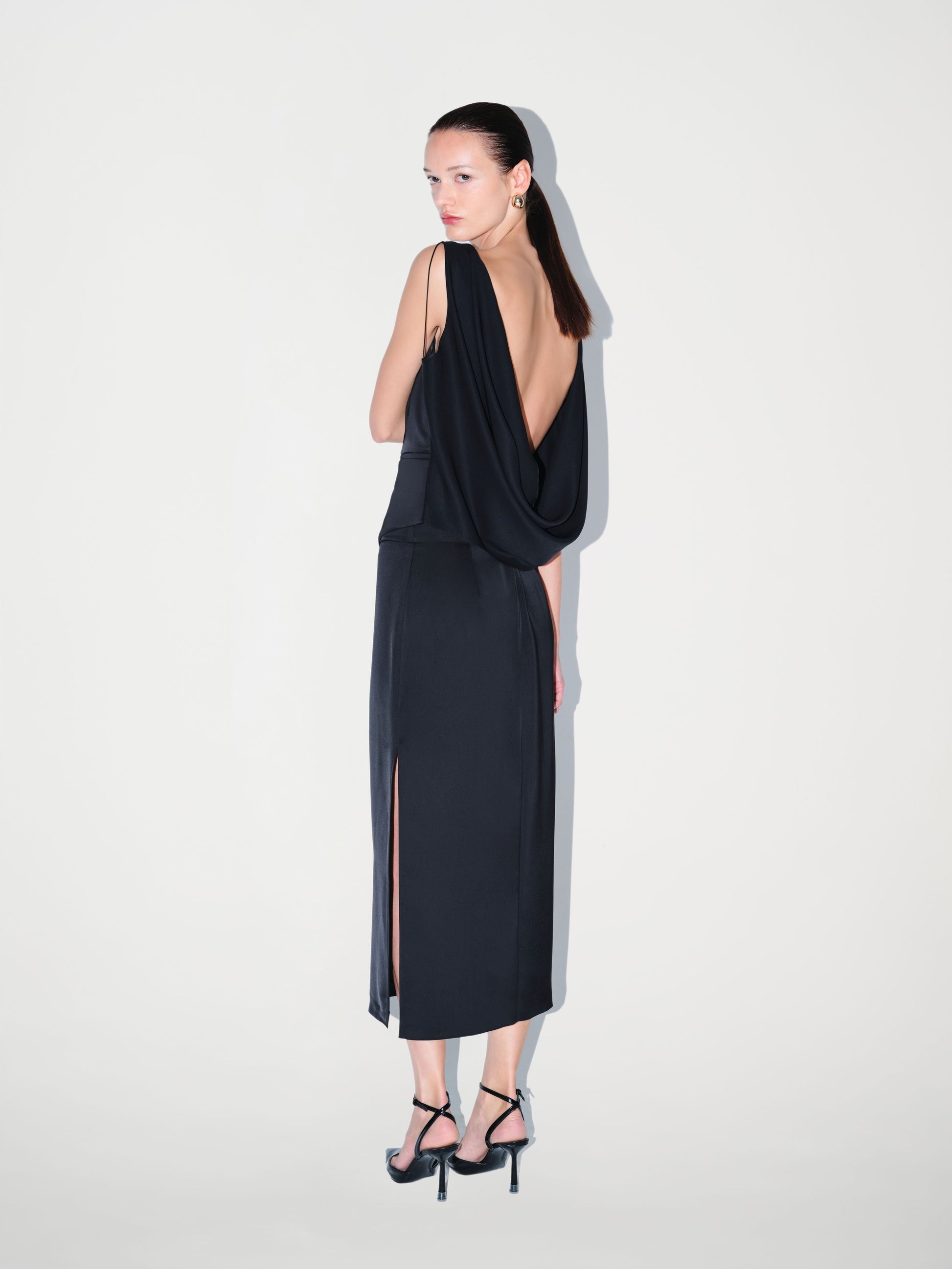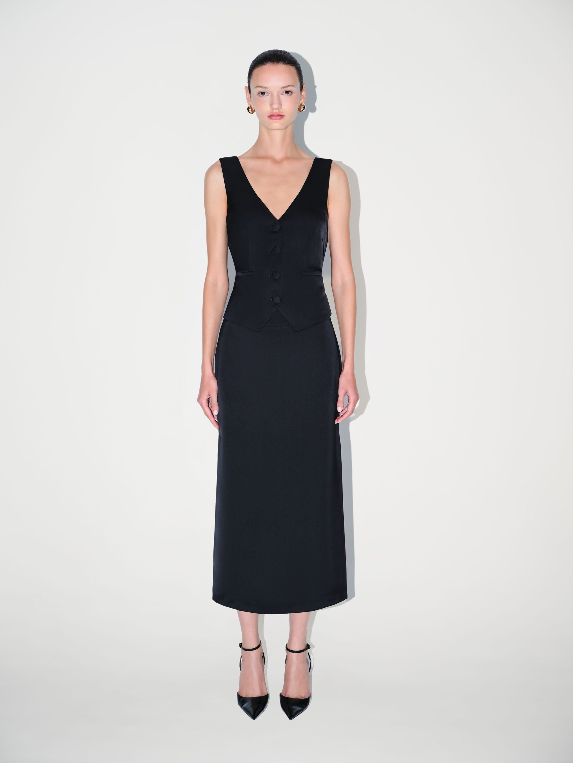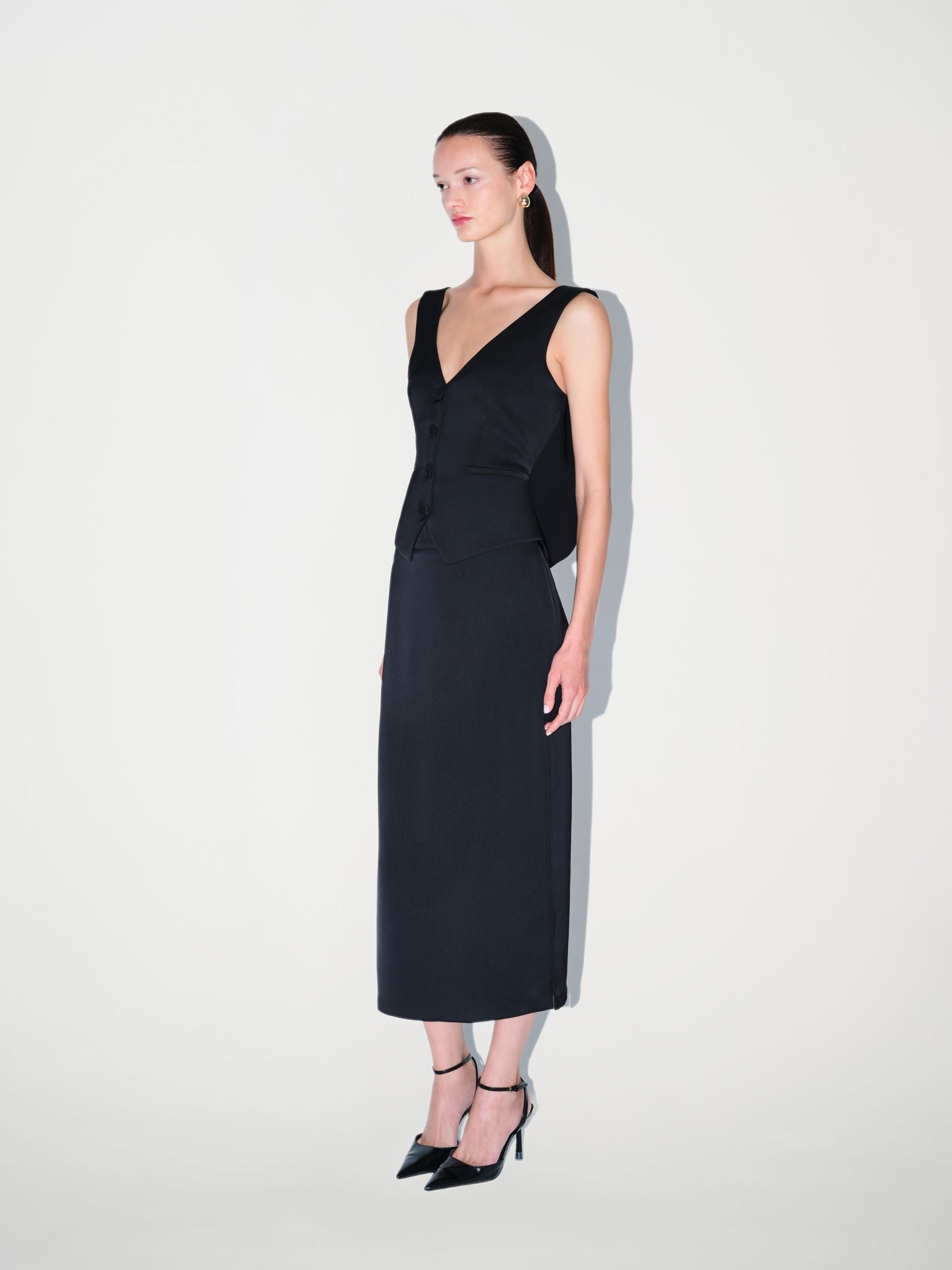 Siyah renkte, kolsuz kısa kesim (crop) yelek modelidir. Ön kısmı klasik V yaka tasarımına sahiptir ve üç adet siyah düğme ile kapanır. Yeleğin bel kısmı kemer veya kuşak gibi bir bant detayı ile vurgulanmıştır. Yeleğin en dikkat çekici detayı ise, arka kısmında derin ve dökümlü bir sırt dekoltesi bulunmasıdır. Askılar ince ve minimalisttir. Kumaşı düz ve mat görünümlüdür.