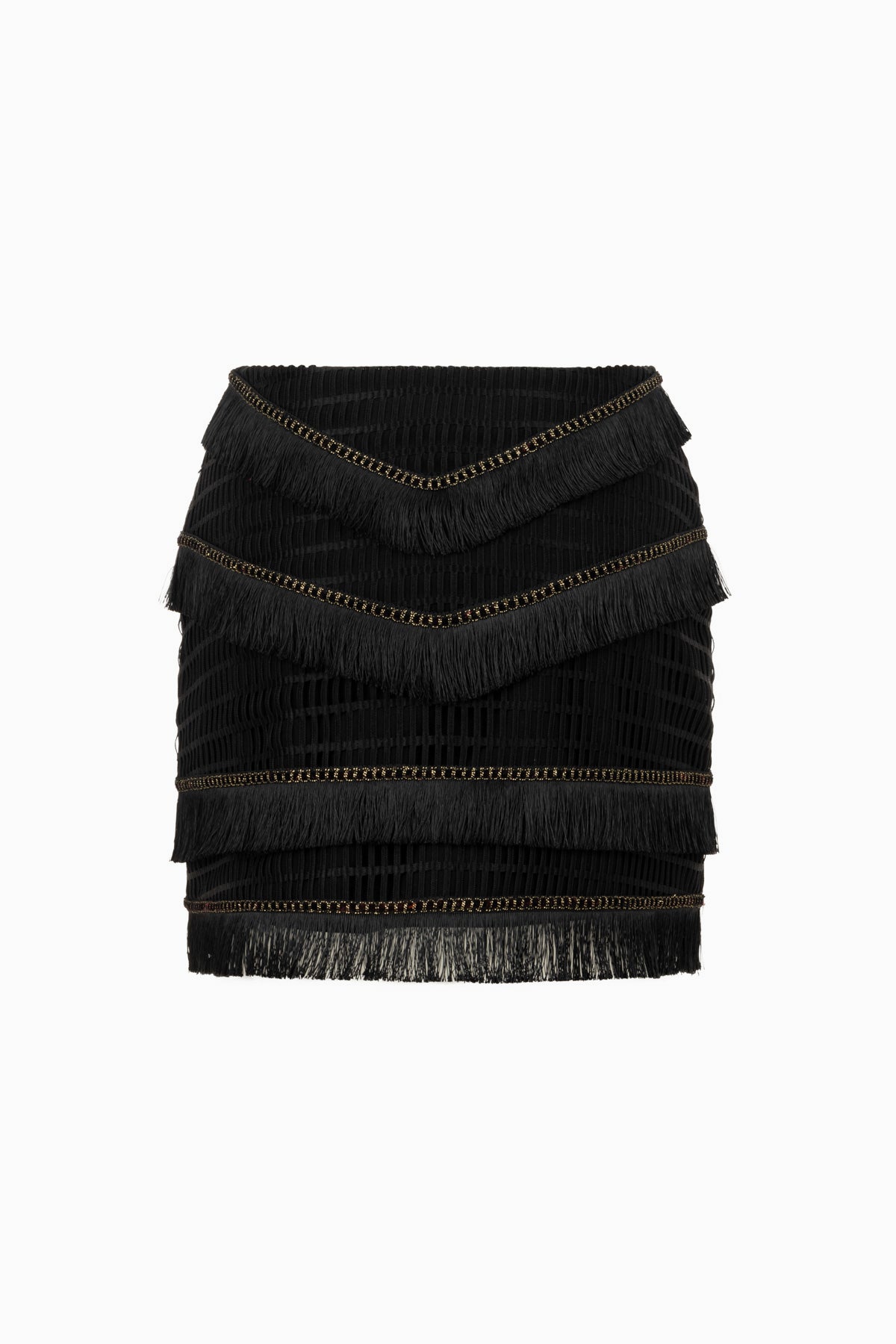 Siyah renkte, mini boy, yüksek bel etek. Dokulu kumaştan üretilmiştir. Etek boyunca yatay ve V formunda yerleştirilmiş püskül detayları bulunur. Gold renkli zincir işlemelerle süslenmiştir. Zincirlerin üzerinde altın tonlu metal arma süslemeleri yer alır. Vücuda oturan kalıptadır. Arka kısmında fermuar kapama mevcuttur.