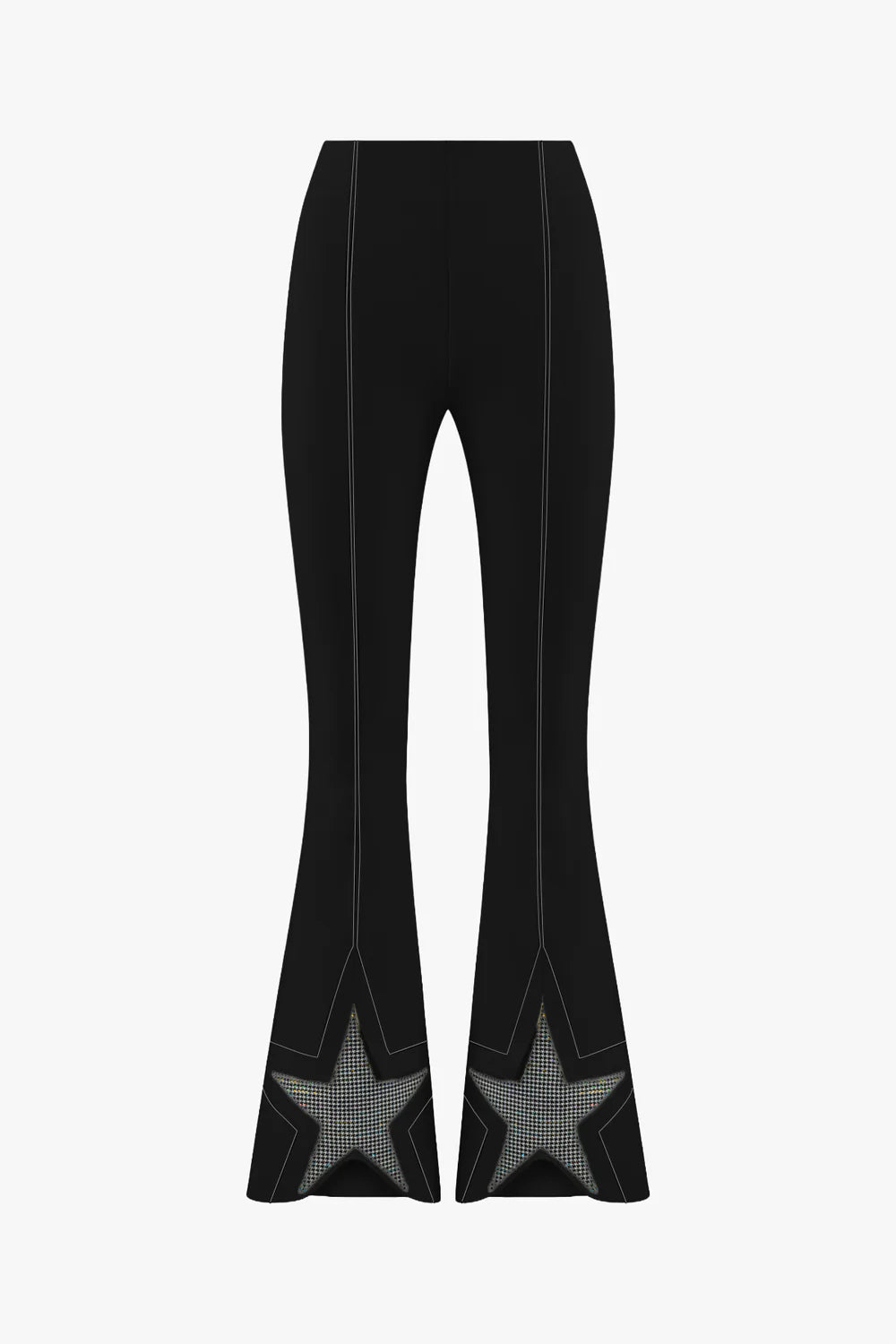 Siyah renkte, yüksek bel kumaş pantolon modelidir. Üst kısmı vücuda oturan dar kesimli olup, dizden aşağıya doğru genişleyen İspanyol paça (flared) bir silüete sahiptir. Pantolonun ön orta ve yan dikişlerinde dikey beyaz dekoratif dikiş detayları bulunur. Her iki paçanın ucunda, büyük yıldız formunda detaylı paneller yer alır; bu yıldızların içi siyah beyaz ekose (kazayağı) desenli kumaşla doldurulmuştur ve çevresi beyaz dikişlerle vurgulanmıştır. Arka kısmı sade ve düzdür.